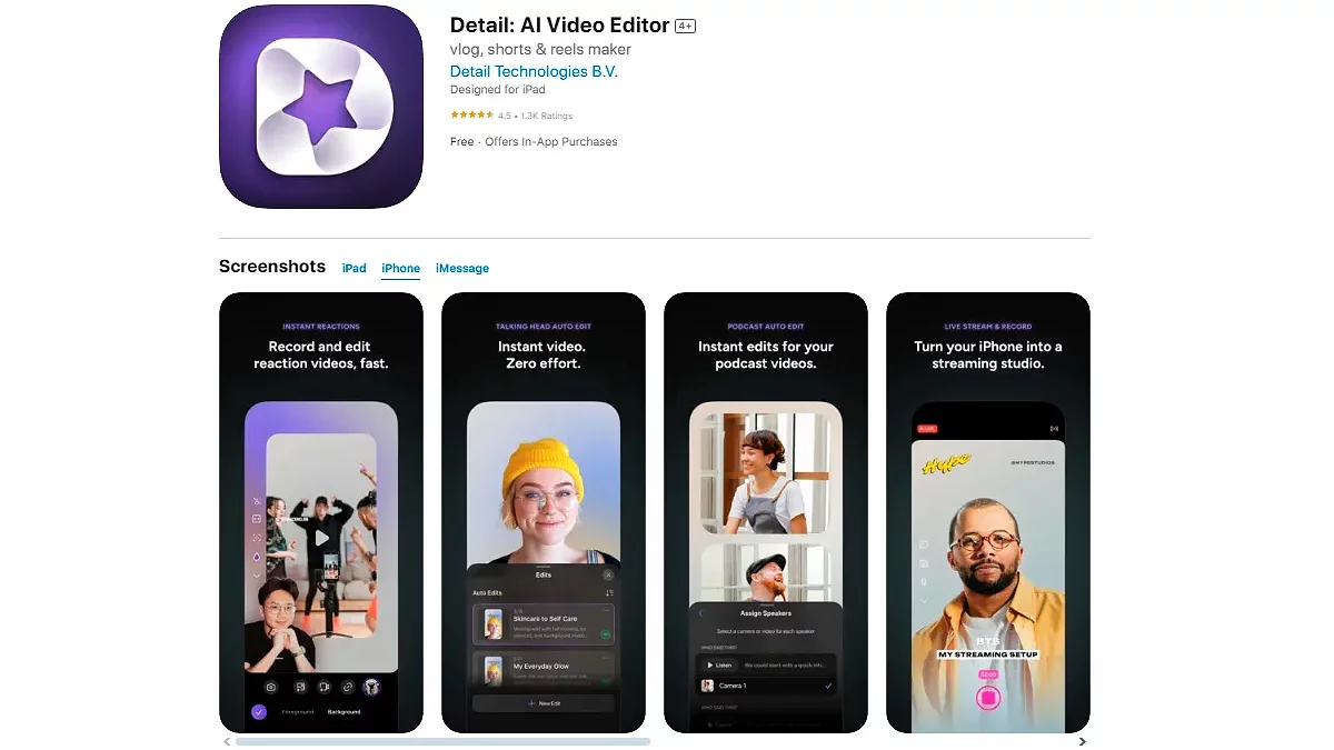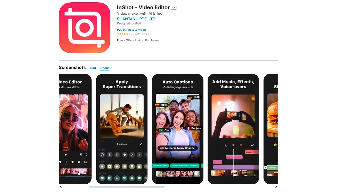 Популярный видеоредактор для iPhone с функциями обрезки, смены пропорций, добавления текста, стикеров, фильтров и музыки. Поддерживает шаблоны для TikTok, социальных сетей и других платформ. Есть бесплатная версия со стандартным функционалом.