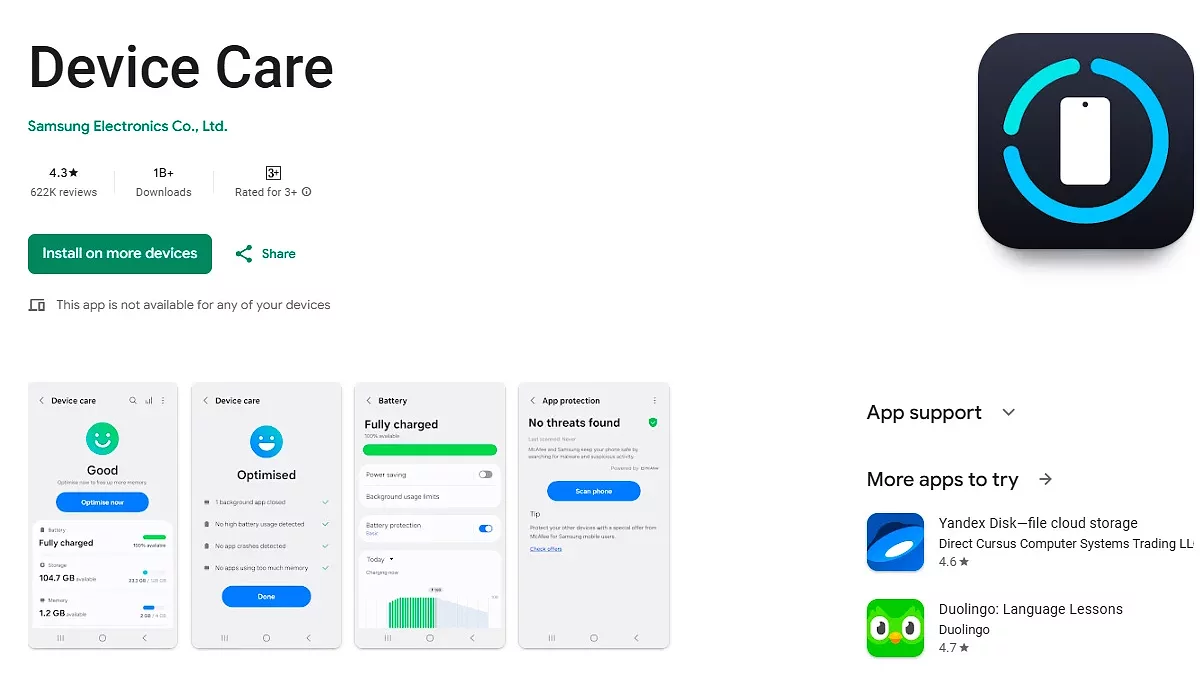 Приложение только для смартфонов Samsung! Стандартный инструмент для диагностики, очистки памяти и проверки на вирусы с поддержкой полезных советов по оптимизации. Обладает интуитивно понятным интерфейсом. Есть альтернативная программа Storage Space с похожим функционалом, которую можно скачать здесь.