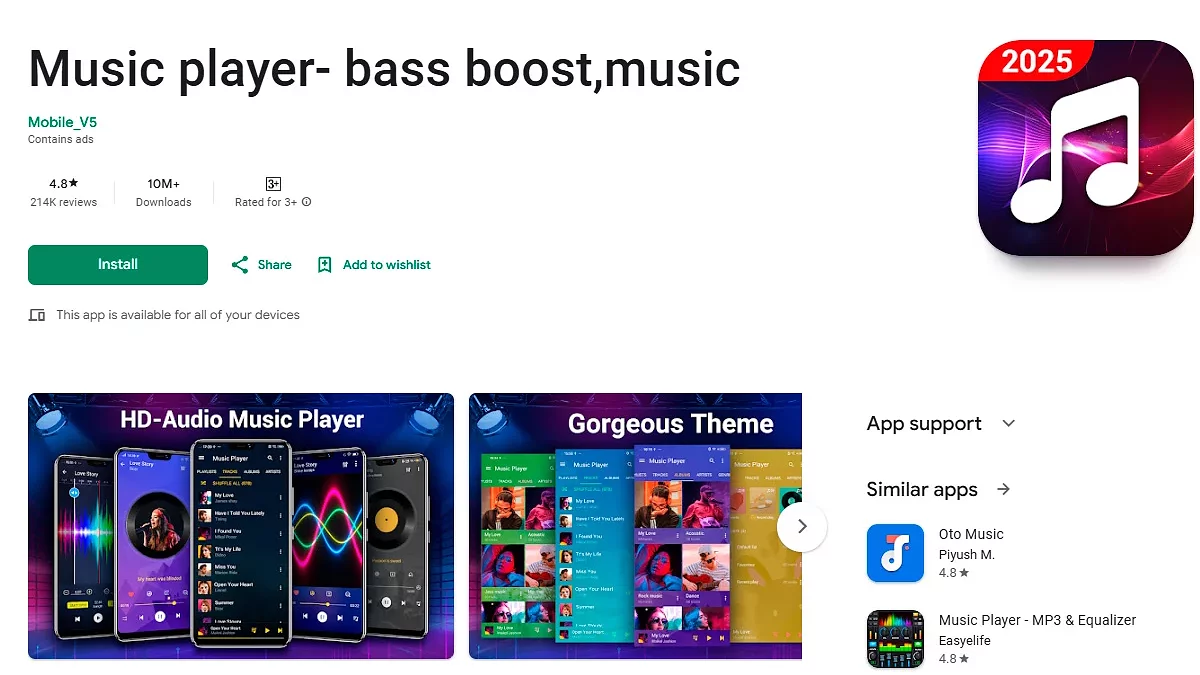 Ещё один музыкальный плеер с возможностью загрузки треков для офлайн-прослушивания, управления плейлистами и эквалайзером. Также есть таймер сна и базовые аудиоэффекты для музыки.