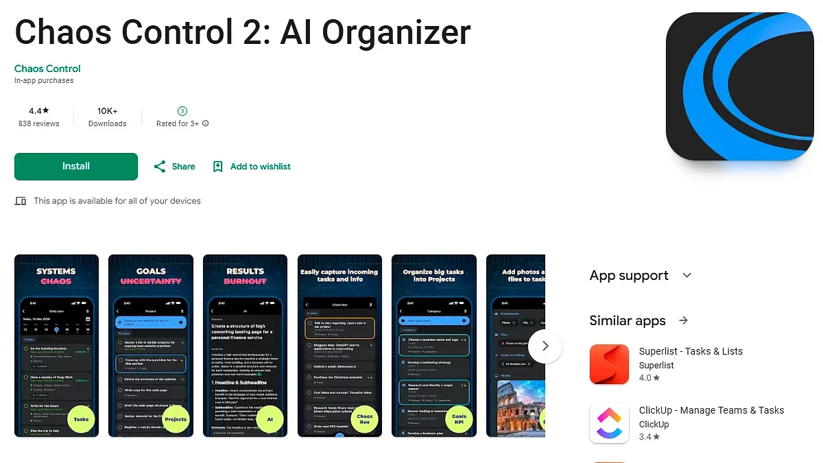 Удобный органайзер личных целей и задач с функциями ассистента на основе искусственного интеллекта. Подходит для планирования работы и личных дел без стресса и с максимальным контролем над своей жизнью. Поддерживает синхронизацию между платформами Web, iPad, Android, цветовую маркировку, трекер времени и Telegram-бота для отправки задач.