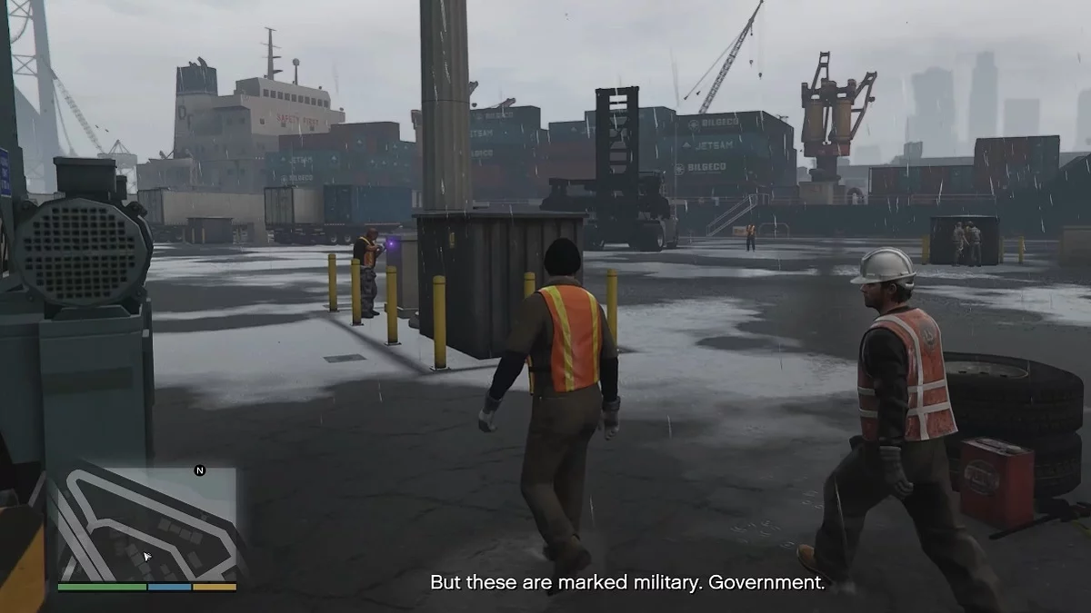 Мы все знаем, как устроены ограбления. Мы знаем, что перед ограблением объекта нужна разведка. И она здесь есть. В миссии Scouting the Port мы едем фотографировать доки. Мы едем туда, потом долго ходим за NPC до места, где активируется скрипт, потом долго забираемся на кран, потом долго грузим контейнеры. Потом, наконец, делаем несколько снимков порта, долго слезаем с крана и это ещё не всё — нам нужно сесть в фуру и отвезти её на склад и только после этого миссия будет завершена. Это всё очень реалистично, но совершено не весело. В кино такие вещи обычно подают через монтаж, а даже если их выдают цельным эпизодом, смотреть за этим проще, чем в этом участвовать.