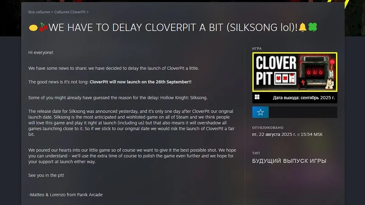 Мы хотим поделиться со всеми вами чем-то важным. Выпуск версии 1.0 был назначен на 9 сентября, но в связи с сегодняшним анонсом выхода Hollow Knight: Silksong, который состоится 4 сентября, мы приняли трудное решение отложить наш релиз.
