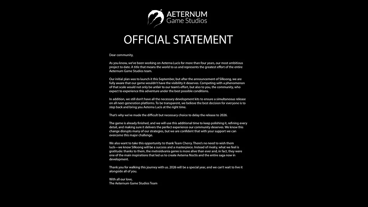 Aeterna Lucis — метроидвания с упором на динамичные бои. Проект, над которым команда работала 4 года, также столкнулся с необходимостью переноса примерно до 2026 года. Примечательно, что разработчики выразили уважение команде Team Cherry, отметив их вклад в развитие жанра.