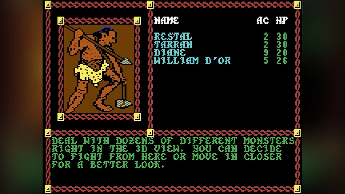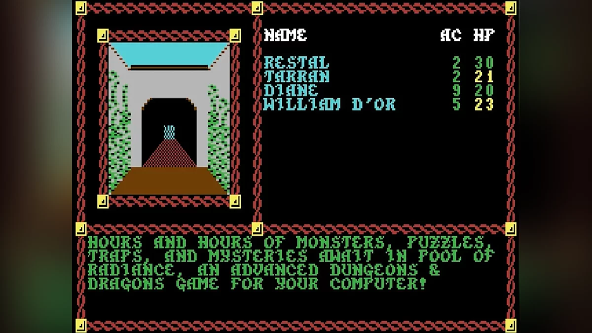 Pool of Radiance — первая официальная CRPG, основанная на правилах Advanced Dungeons & Dragons. Основной сюжет разворачивается в сеттинге Forgotten Realms, где игроку предстоит очистить город Флан от орд монстров и раскрыть демонический заговор. Проект стал основой для всех последующих игровых адаптаций D&D. Система заклинаний, прокачка, случайные столкновения и пошаговые сражения в изометрии были собраны в единую систему, которая стала фундаментом геймдизайна ролевок.
