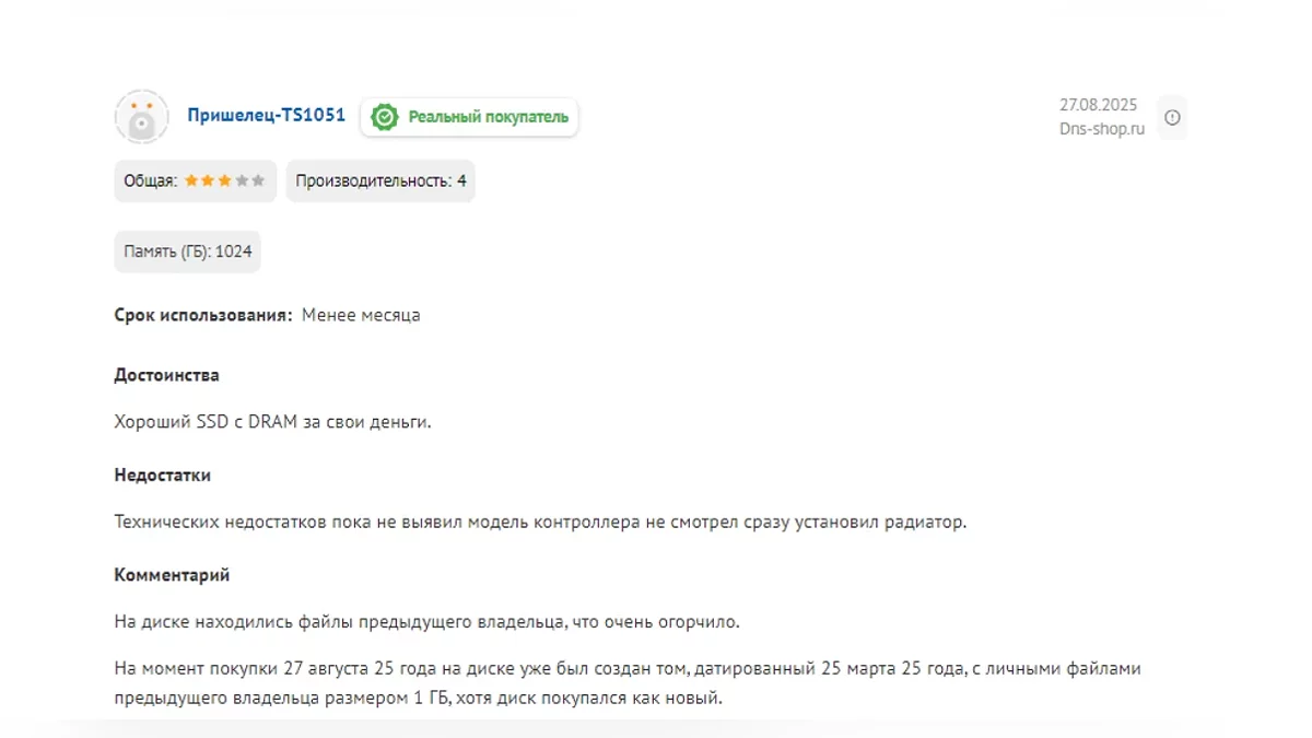 - Скромный ресурс записи. Для версии на 1 ТБ показатель TBW ограничен примерно 600, что уступает более дорогим моделям;
