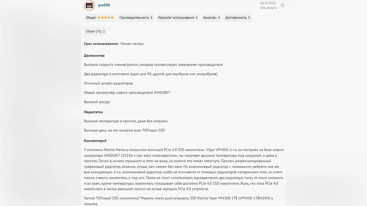 - Скорость не дотягивает до топовых PCIe 4.0-решений. Для задач, требующих больших скоростей в работе, лучше рассмотреть другие модели;
