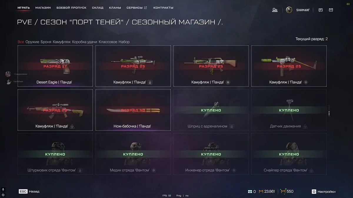 В то же время PvE-сезон пополнился оружейной серией «Панда», доступной за короны навсегда. В коллекцию вошли HK433, Desert Eagle, USAS-12, ПП-2011 «Кедр-Para», СКС FAB и нож-бабочка. Ассортимент PvE-магазина также расширен: в продажу возвращены ножи прошлых сезонов и добавлены новые внешности, которые теперь можно получить без ограничений по рангу.