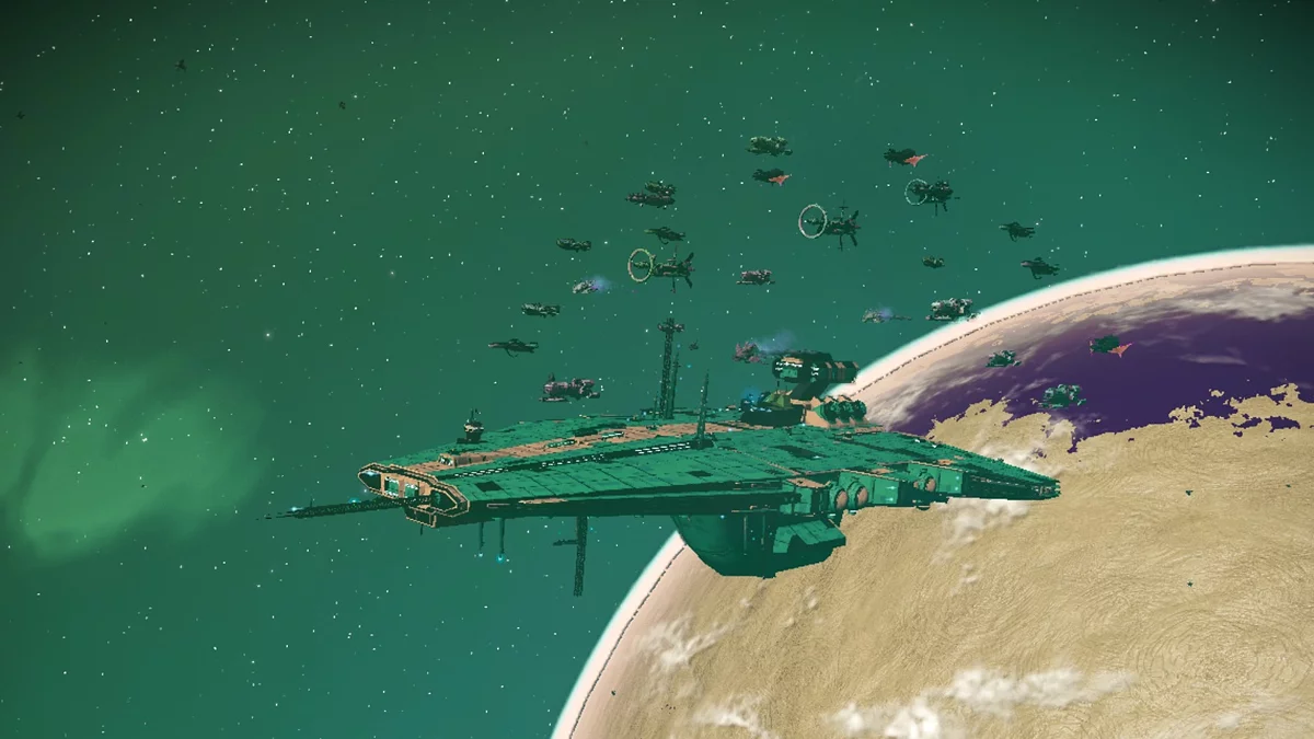 Отдельная большая часть игры — создание космических летательных средств. Звездолеты можно было создавать и раньше, а после последнего большого обновления игра позволяет строить корветы — большие корабли, внутри которых можно походить (как в каком-то Starfield), обустроить, совершить выход в открытый космос и даже прыгнуть с орбиты на поверхность планеты. Завораживающее зрелище, скажу я вам. Помимо внешней красоты, эти возможности влияют и на сам геймплей. Этакий мини-грузовой корабль, масштабы и возможности, конечно, не такие, но многие моменты весьма схожи.