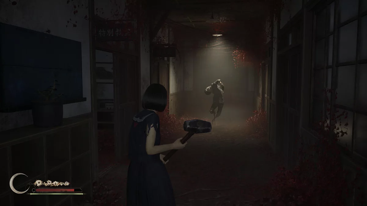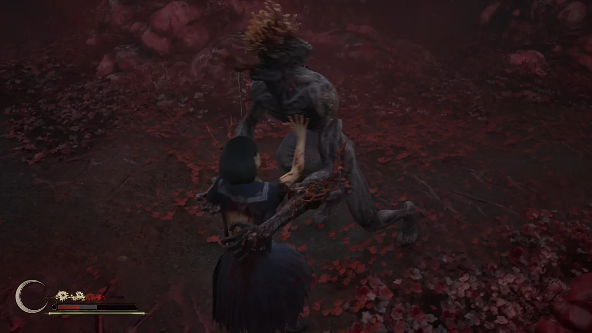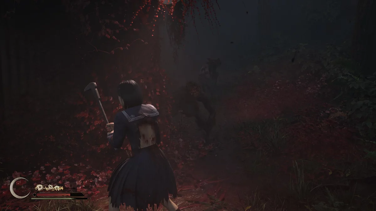 Боевая система — на удивление многогранная. Во время схватки с очередным порождением тьмы переживать нужно не только за полоску здоровья, но и за выносливость. Если бездумно махать топором или постоянно спамить кнопку уклонения — быстро выдохнешься. Кроме того, огромное значение имеет шкала рассудка Хинако, которая уменьшается при виде особо жутких созданий или когда атакуешь неприятеля в режиме фокусировки. Этот режим — критически важен: если активировать фокус, то Хинако сможет наносить мощный удар, выбивающий врагов из равновесия. Фокусировка ещё и увеличивает окно тайминга, когда можно парировать выпад монстра. Подобное действие тоже оглушает противника.