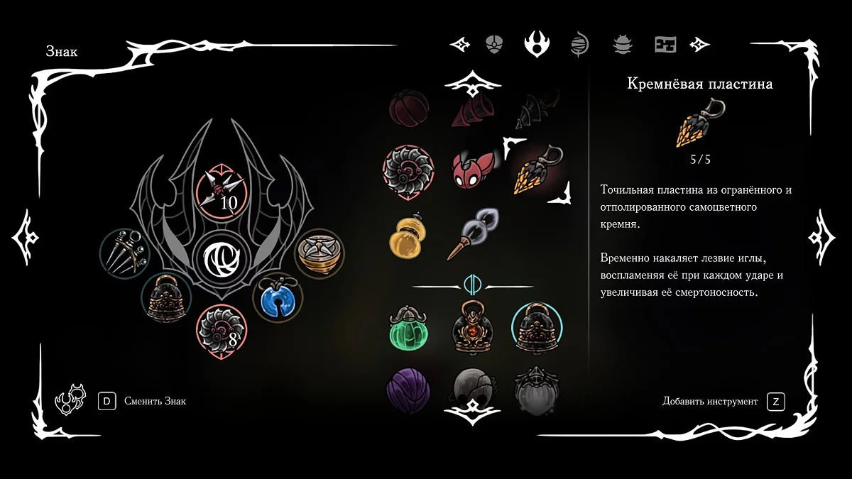 «Инструменты» — это замена амулетов из Hollow Knight. По сути, изменений мало: здесь есть инструмент-компас, инструмент для защиты во время исцеления и другие. Однако есть нововведение. В процессе прохождения мы открываем знаки, каждый из которых даёт уникальные способности и меняет атаки иглой. Инструменты делятся на три типа: оружие (красные), для исследования (жёлтые) и различные (синие). У каждого знака есть определённое количество ячеек для каждого типа. Например, у знака «Зверь» нет синих ячеек, а у «Ведьмы» — нет жёлтых.