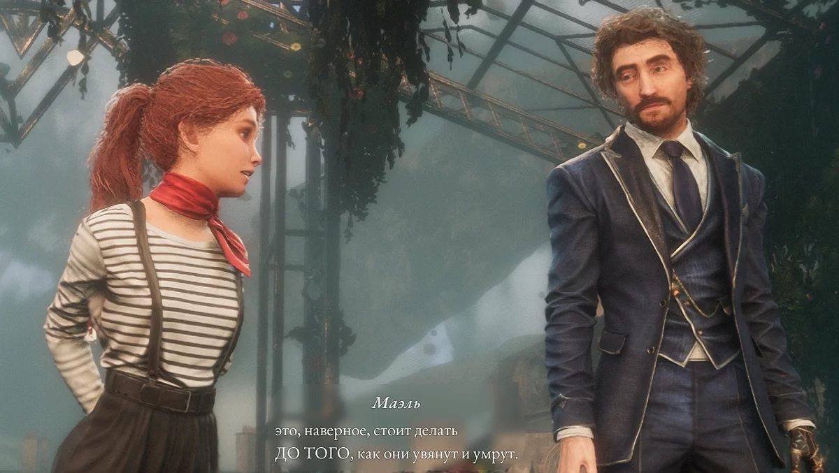 Игра начинается с разговора Маэль и Гюстава. И здесь все сделано как по учебнику: показывать, а не рассказывать. Меткие характерные диалоги. Интрига (Что за Софи? Почему они расстались?) И даже огроменная метафора с самого начала.