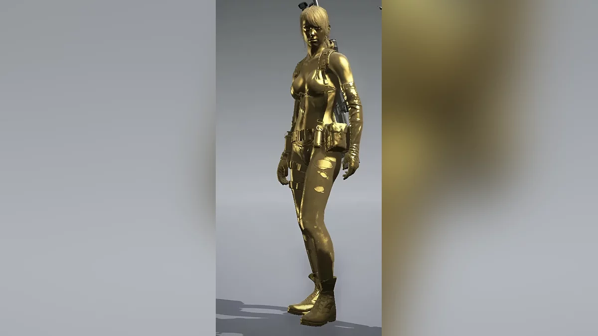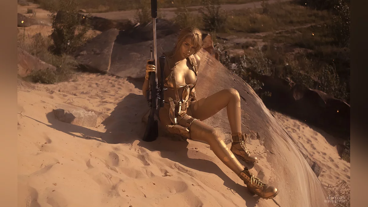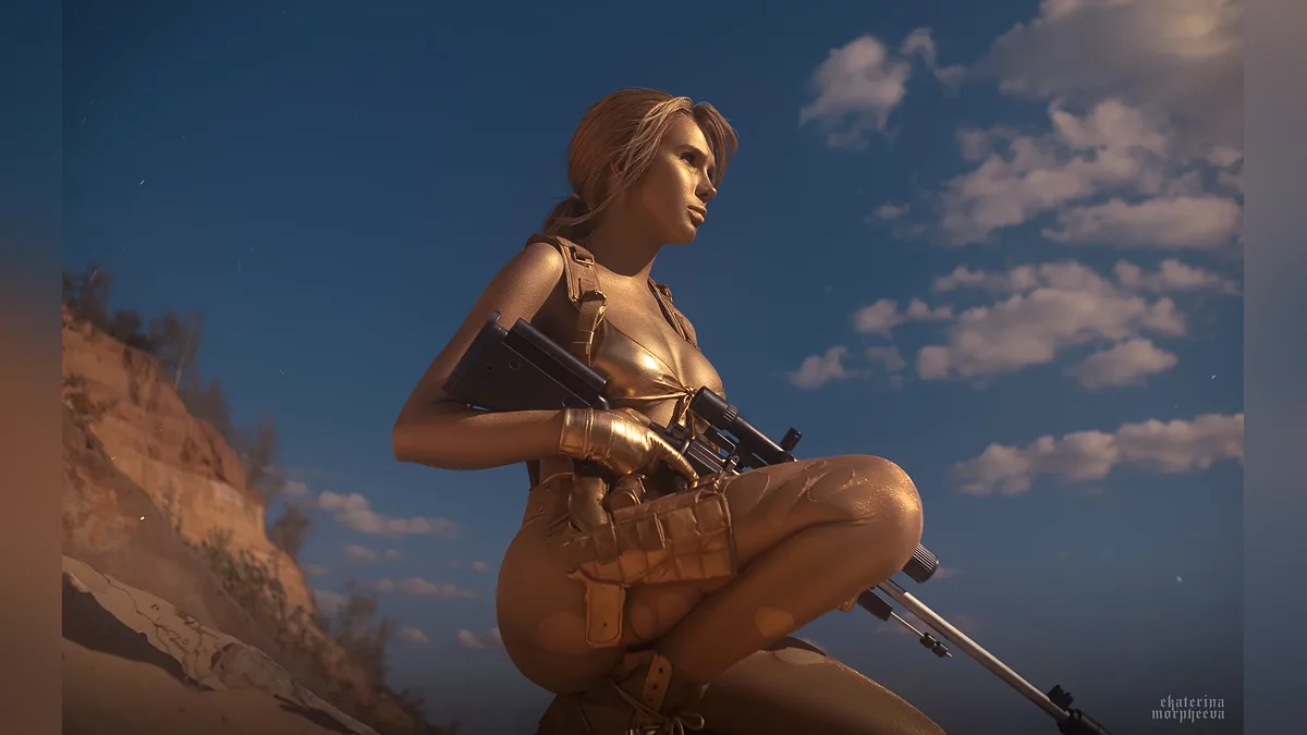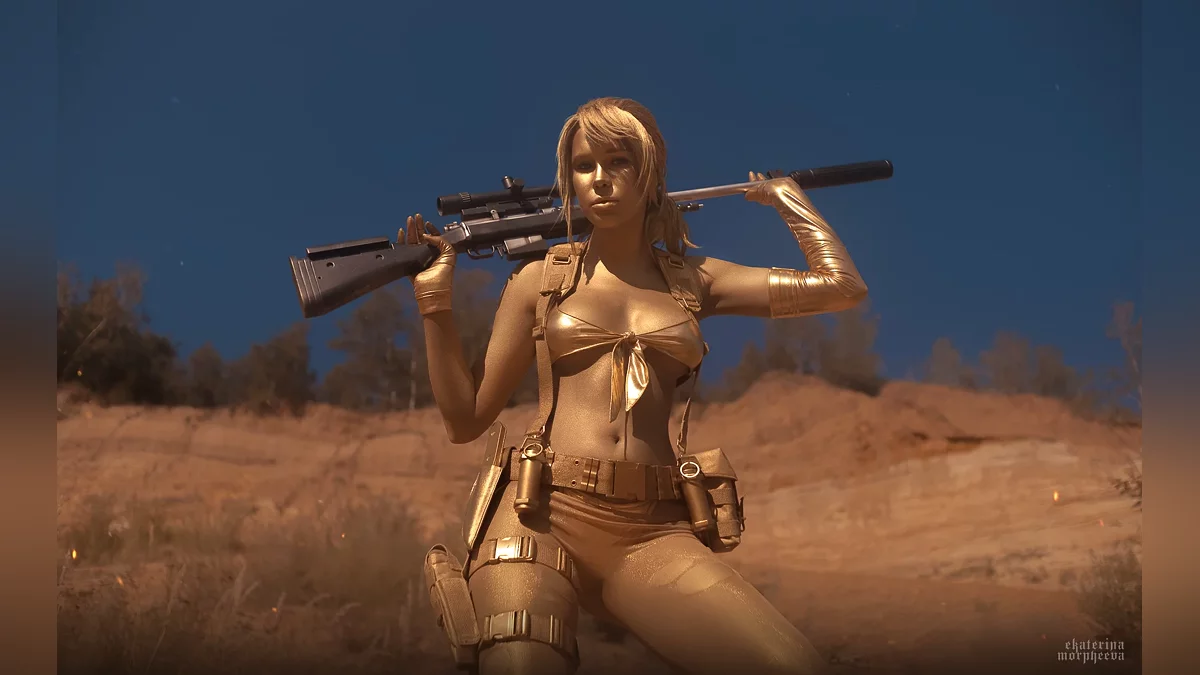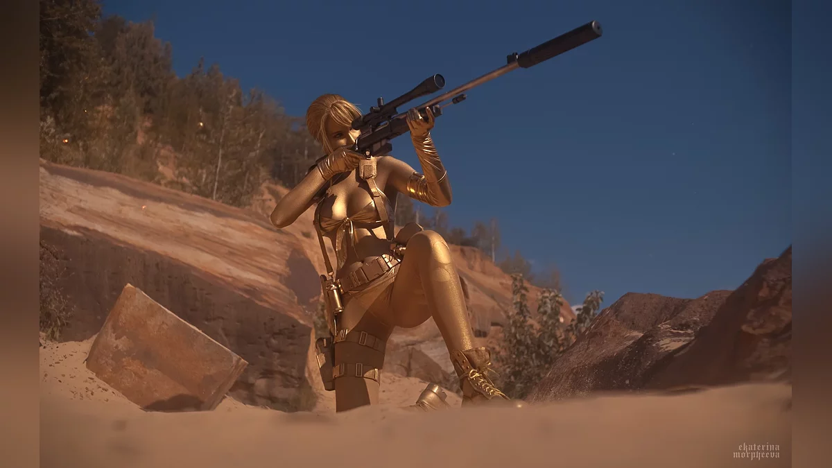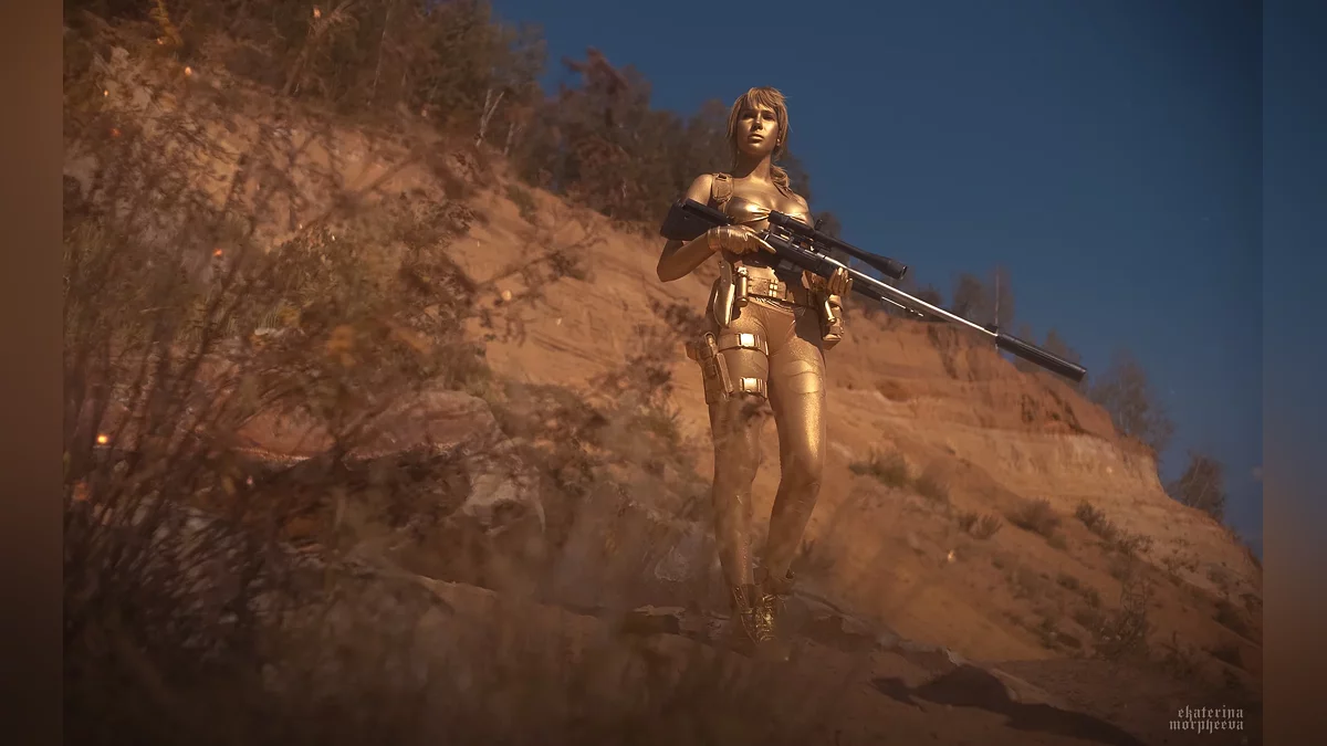 Среди скинов Молчуньи есть уникальный золотой облик. Он выглядит так, словно снайпершу облили краской. Его можно получить, если развить отношения с девушкой до ста процентов. Именно к этому образу обратилась Frau_Haku. Фотограф — Ekaterina Morpheeva. А если вас заинтересовала Metal Gear Solid 5 — обратите внимание на нашу статью.