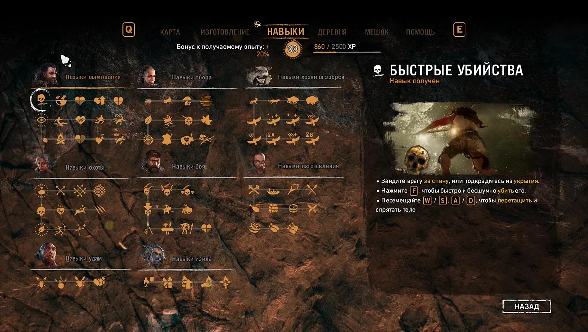 Отличий от других частей довольно много: от вооружения до древа навыков. Если начать с оружия, то самое очевидное — отсутствие огнестрельного оружия. Зато остались луки и есть бомбы, также появились дубинки, копья, праща (используется для метания камней). Чтобы разнообразить игру, дубинки и копья можно метать, конечно же, есть сильные и слабые удары. Кроме этого, они ломаются, и необходимо регулярно пополнять запасы оружия благодаря его крафту. Про остальные особенности я скажу чуть позже.