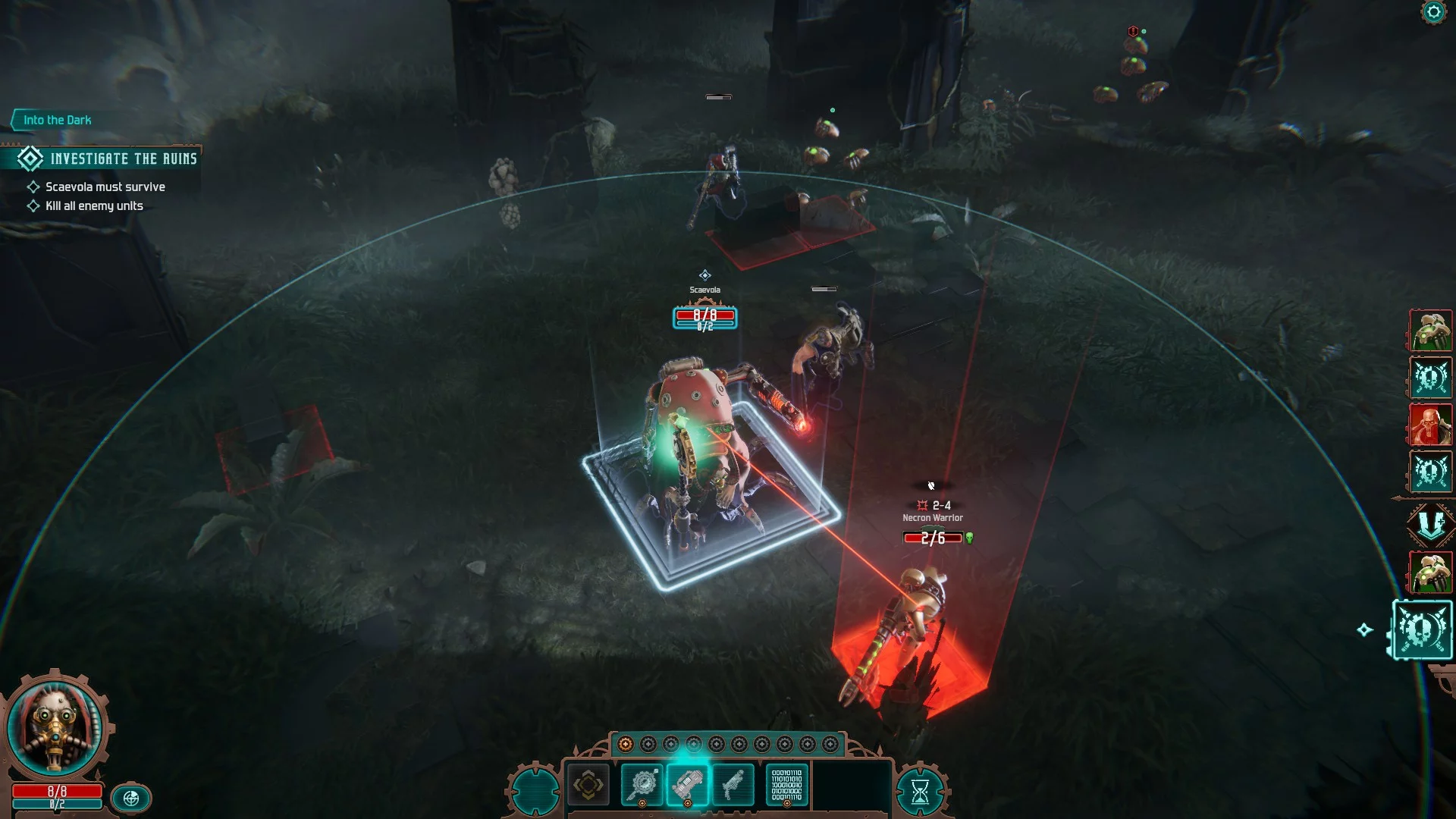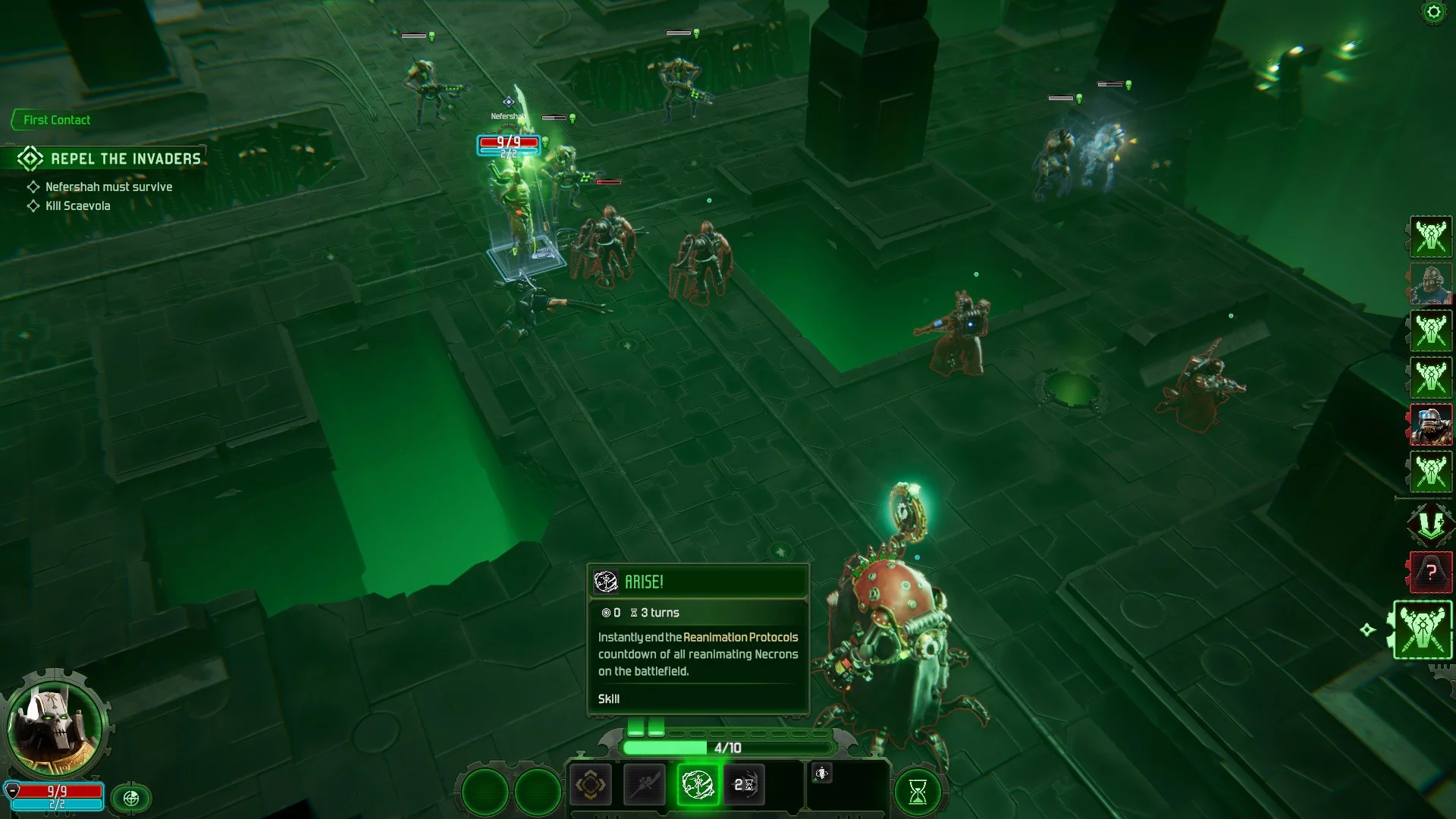 В бою юниты некронов не особо мобильны и ходят недалеко, но зато выдерживают чуть больше урона. Главное — командир ксеносов может активировать протокол реанимации, после чего уничтоженные машины «воскреснут». Кроме того, по ходу сражения, когда некроны наносят урон, заполняется шкала доминирования, которая открывает им доступ к новым мощным способностям. Например, скарабеи получают возможность самодетонироваться.