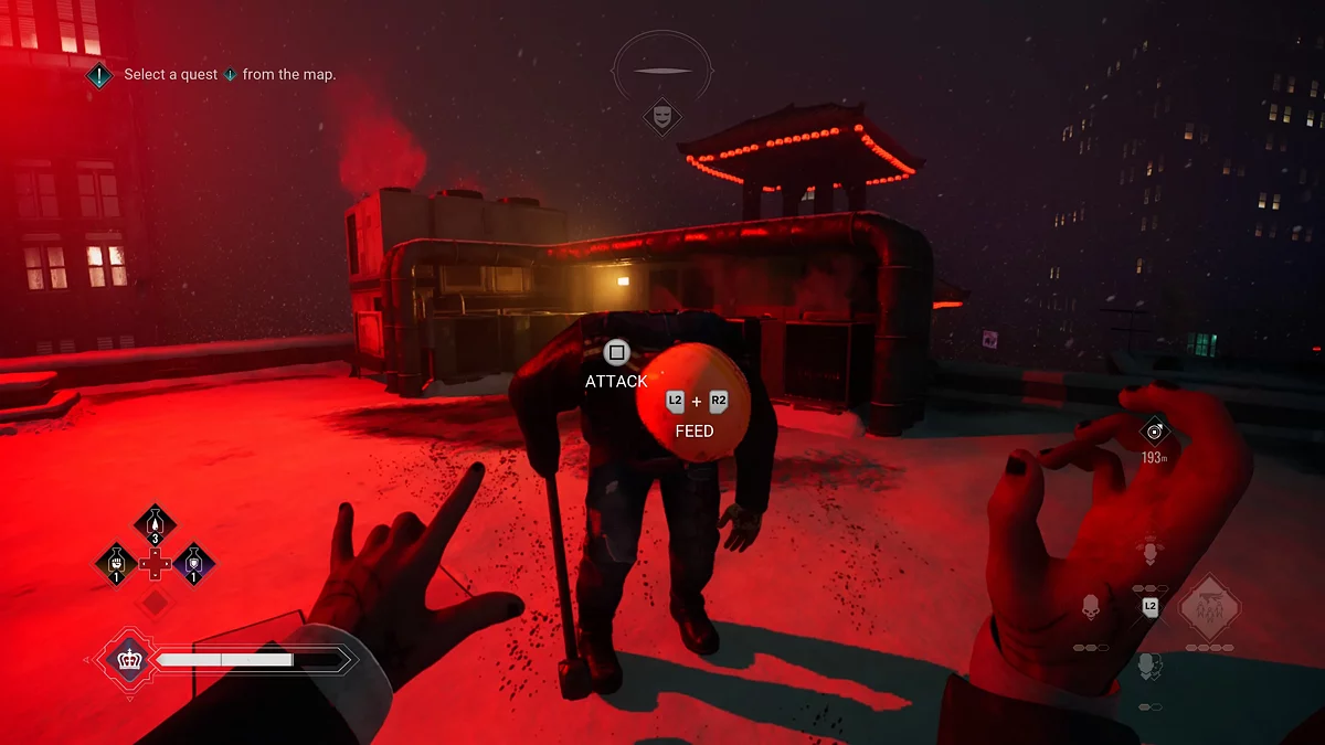 На бумаге новая система выглядит интереснее, чем то, что было в оригинальной Bloodlines, однако на практике ты взаимодействуешь с ней настолько часто, что сложно игнорировать поверхностную реализацию. Подошёл к NPC, сказал одну фразу, отвёл в аллею, укусил. Если кто-то увидел — убежал. И так за всё прохождение пару десятков раз. В какой-то момент я открыл дисциплину невидимости просто чтобы ускорить процесс — питаться сразу на месте, а не каждый раз искать тёмный переулок.