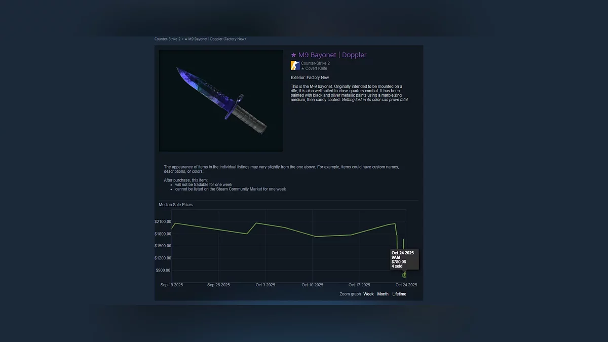 Так, стоимость редких ножей за сутки в среднем упала где-то на 43%. Но это — в среднем. Есть примеры более существенных проседаний ценников: тот же нож типа M9 Bayonet | Doppler подешевел с $2053 до $780.