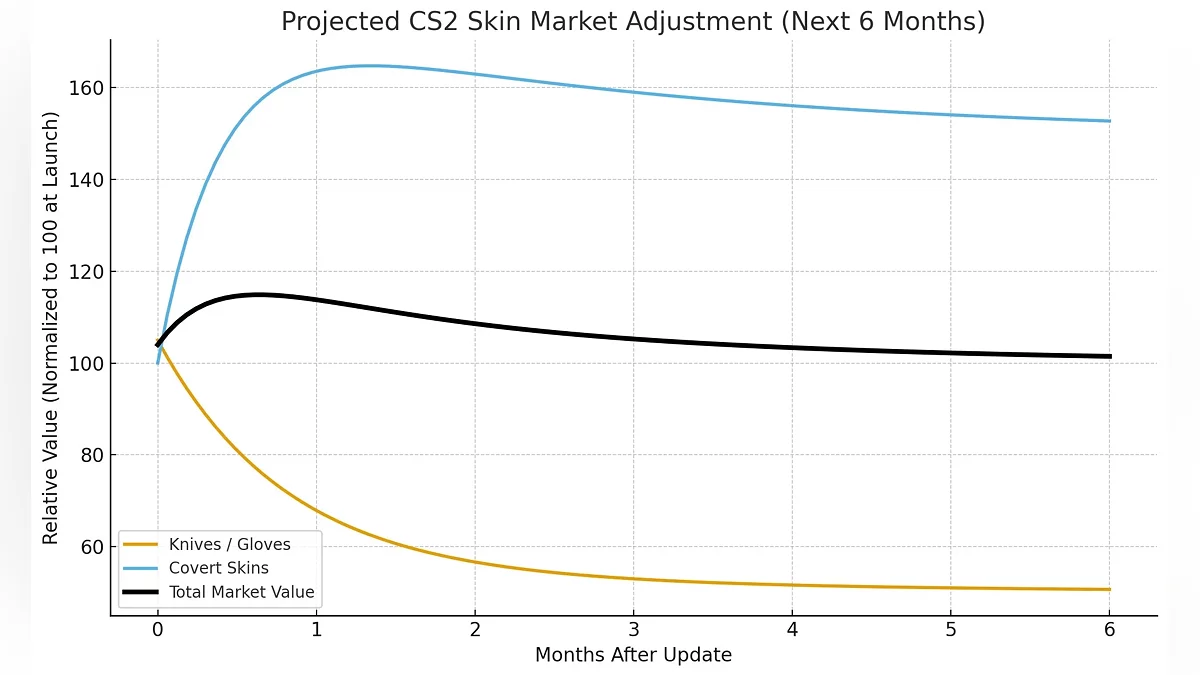 Ножи и перчатки резко подешевеют (на 40–50%), поскольку новый путь через обмен обрушит рынок из-за притока предметов, а скины уровня Covert, наоборот, краткосрочно подскочат в цене — все бросились скупать их как «сырьё». Со временем этот всплеск спадёт, и рынок стабилизируется примерно на 5–10% ниже прежнего уровня. Это не крах, а скорее коррекция.