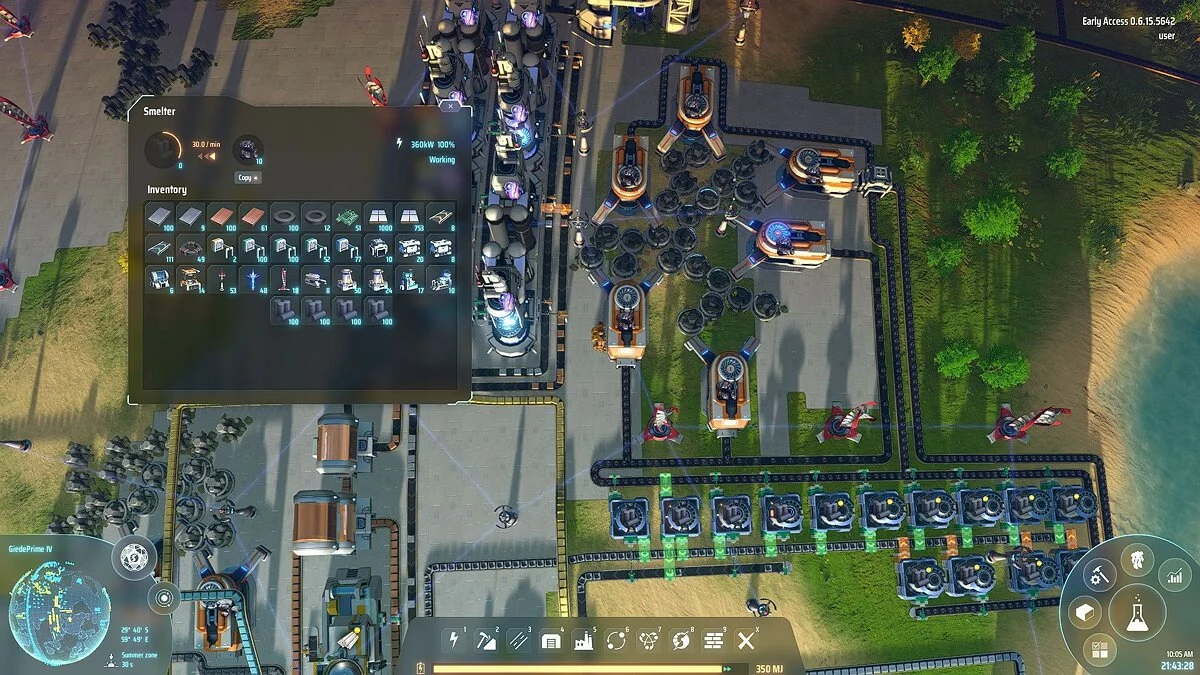 Первые 10–15 часов были суровыми: примитивная графика, непонятные иконки, запутанные цепочки производства, робот-бегунок на безжизненной планете, газовый гигант на горизонте. И тысяча вопросов. Где наука? Кто додумался цеплять здания к конвейерам через эти податчики? Вот я собрал ресурсы, произвел какие-то детали — а зачем? Я не удивлен, что интернет до сих пор кипит запросами: «калькулятор производства», «русификатор», «вики». Игра глубокая и многие хотят получить понятные инструкции на русском.