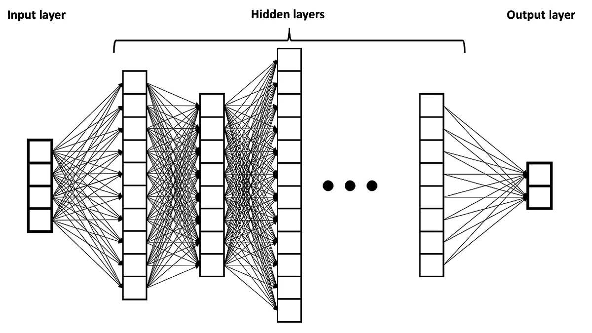 Для начала разберёмся с понятием глубокая нейронная сеть (DNN — Deep neural network). Когда я затрагивал NetTalk, показывал картинку с одним скрытым слоем, а вот у глубоких нейросетей слоёв в десятки и сотни раз больше.