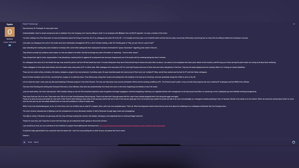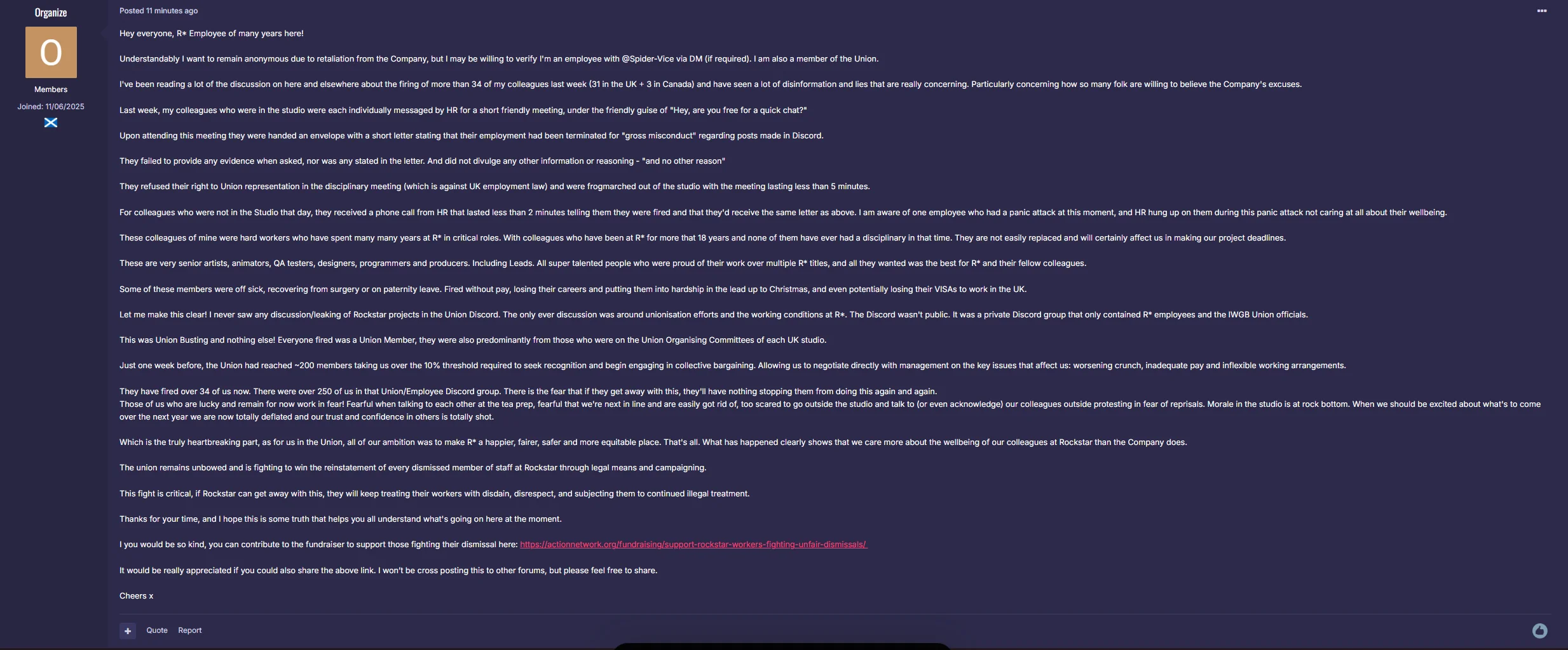 Пост предоставляет важный дополнительный контекст скандалу. Автор комментария пишет, что уволено было 34 человека (31 в Великобритании и 3 в Канаде). После коротких встреч с HR, длившихся в среднем не более пяти минут, людей буквально выводили из офиса. Согласно анонимному пользователю, сокращённые сотрудники «были опытными работниками, многие — с десятилетиями стажа в Rockstar, некоторые — более 18 лет без единого дисциплинарного взыскания. Это ведущие художники, аниматоры, тестировщики, дизайнеры, программисты и продюсеры».