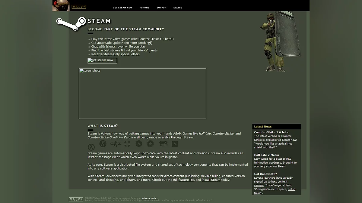 Официальный же релиз состоялся 12 сентября 2003 года. Steam изначально был клиентом для автоматических обновлений игр Valve, серверным браузером и античитом. Counter-Strike 1.6 стал первой игрой, требующей Steam.