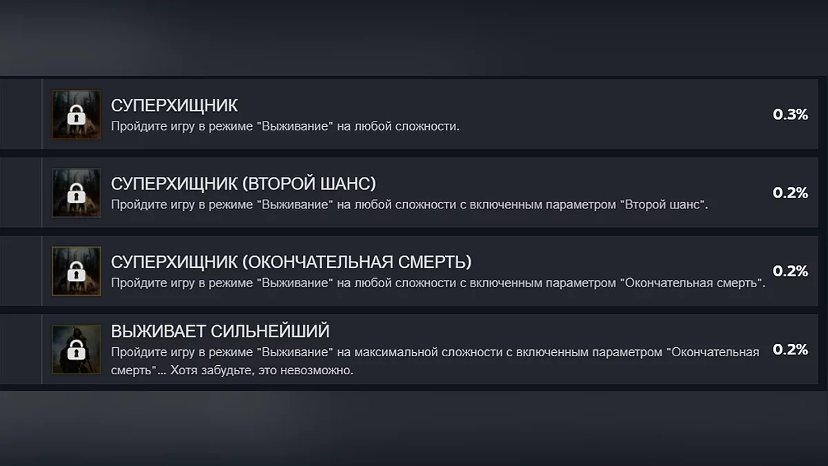 Конечно же, есть и сложные достижения, к примеру прохождение игр на время. Такие можно встретить в Postal 2, Resident Evil 7 Biohazard, Little Nightmares и другие.
