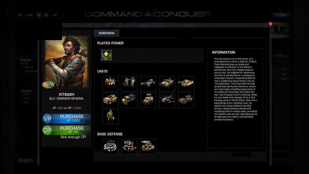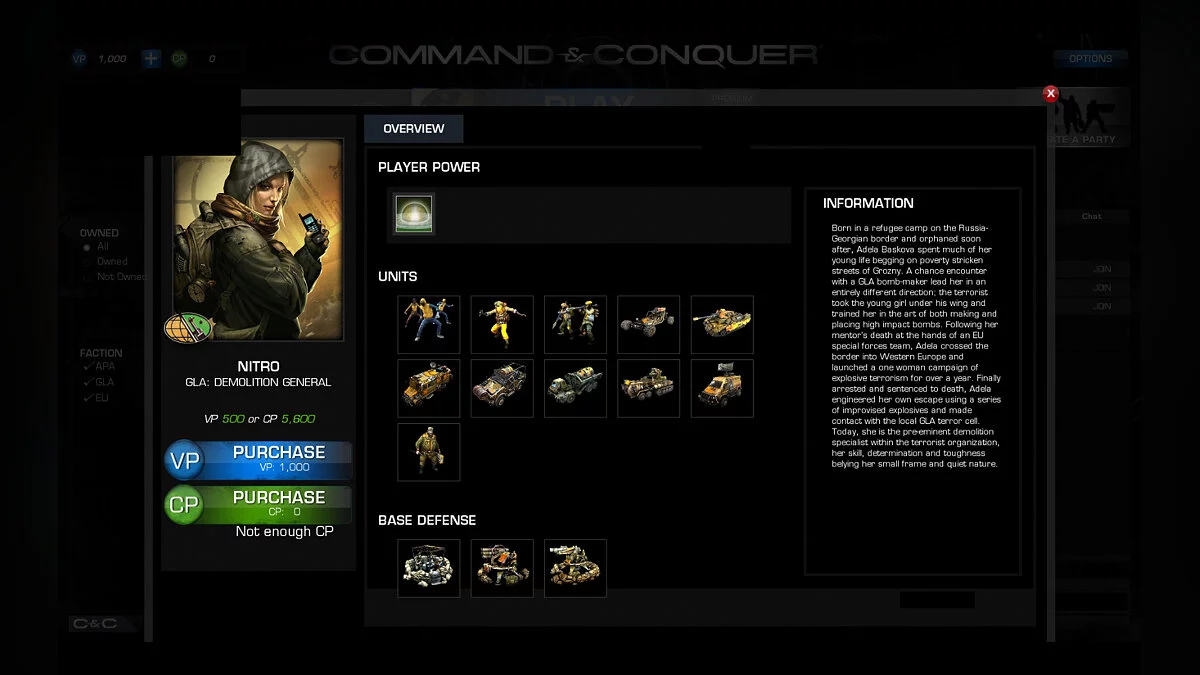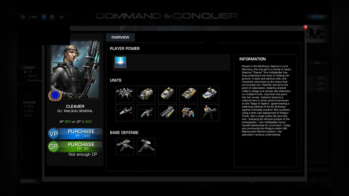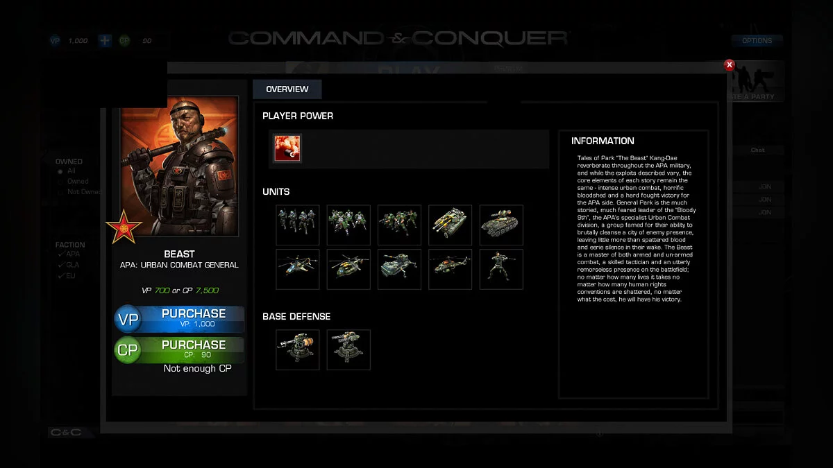 Как и следовало ожидать, новых генералов можно было купить как за деньги, так и за игровую валюту. Честно говоря, начинающий игрок, сыгравший два-три матча против ИИ, смог бы получить около 500 внутриигровых кредитов. Однако чтобы купить генерала потребовалось бы 7 000 — 8 000. За победы в играх против человека давали куда больше кредитов, но ведь надо было сначала победить.