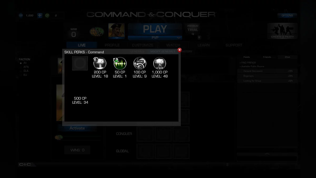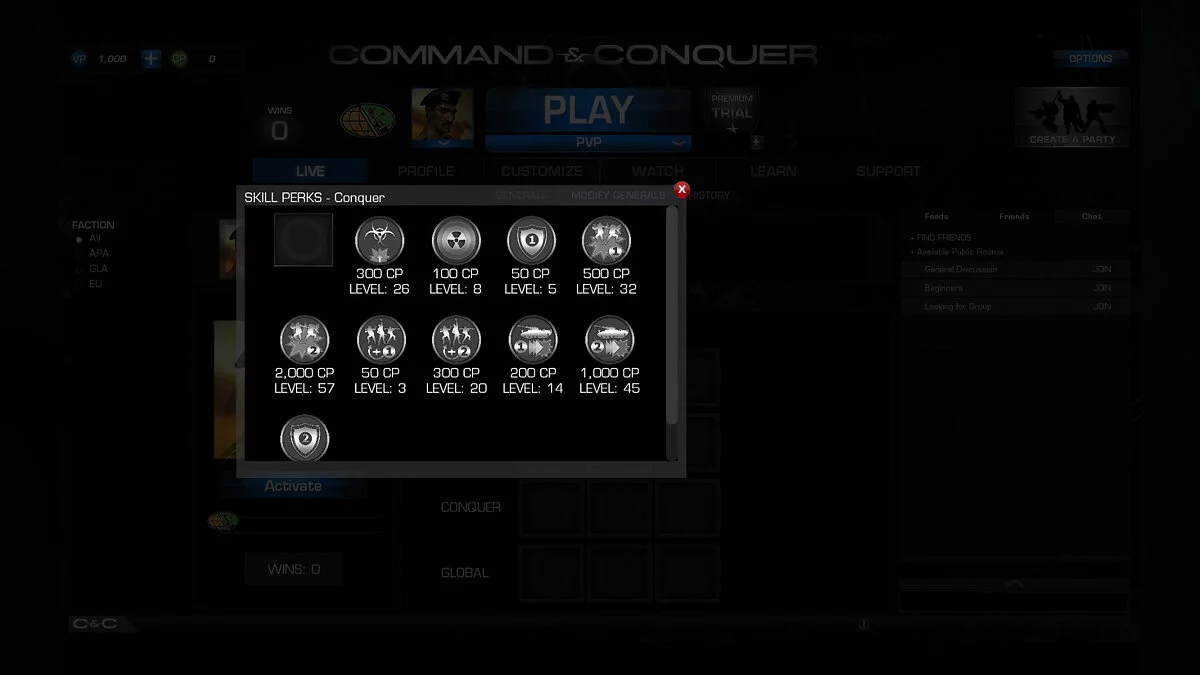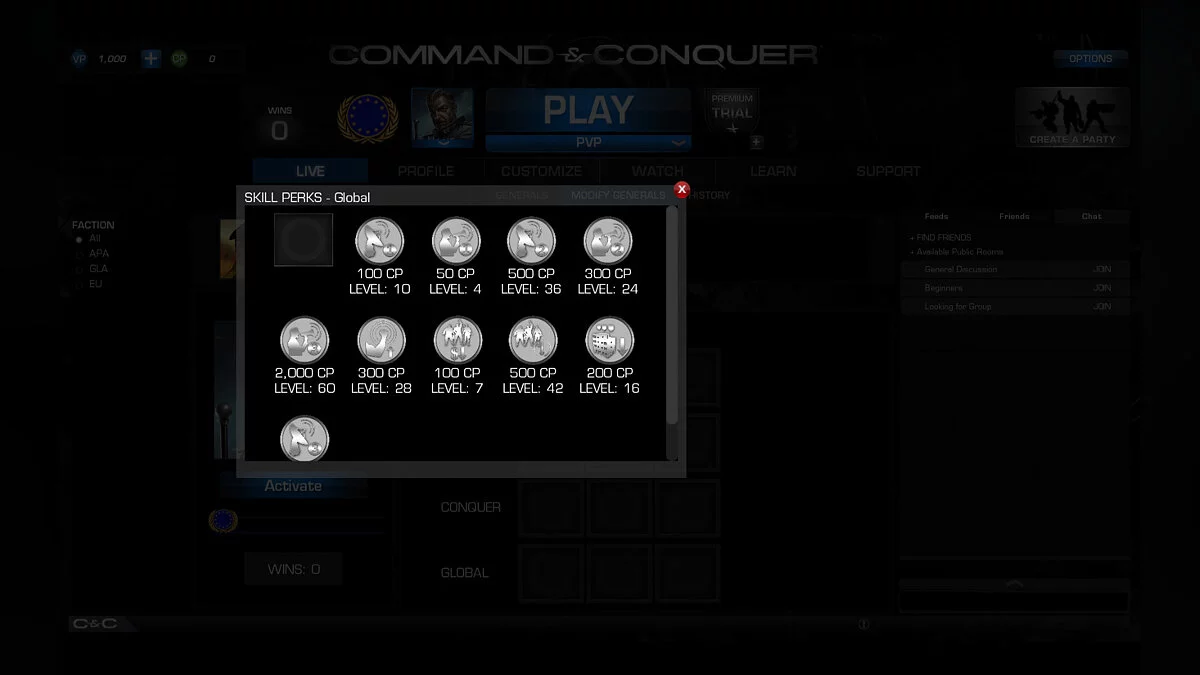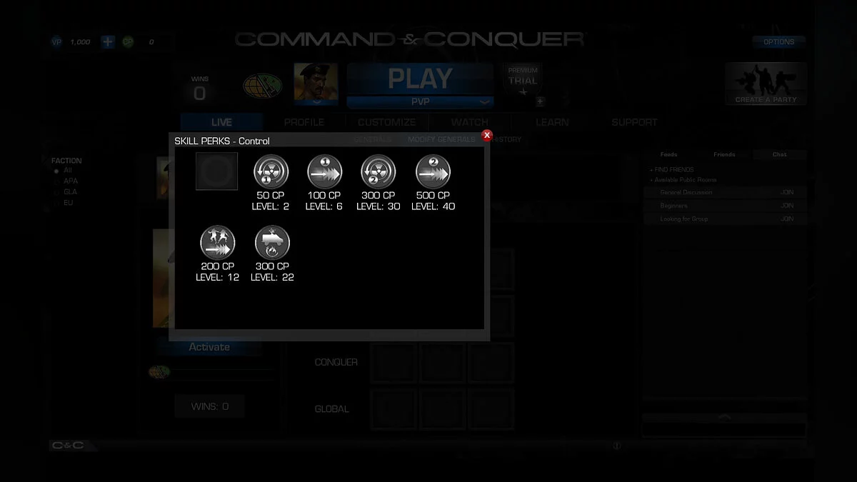 Однако новые генералы — это еще не все то, куда игрок мог потратить честно надроченные в игре деньги. Вы могли купить улучшенные способности для своего генерала. Назывались они Command, Control, Conquer и Global. Перки в графе Command улучшали глобальные способности, а в графах Control, Global и Conquer уменьшали стоимость юнитов и увеличивали их огневую мощь.