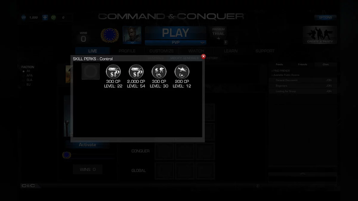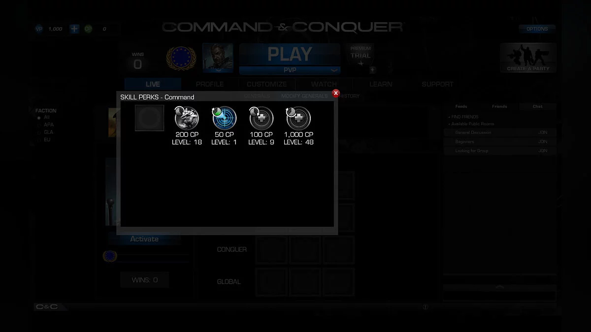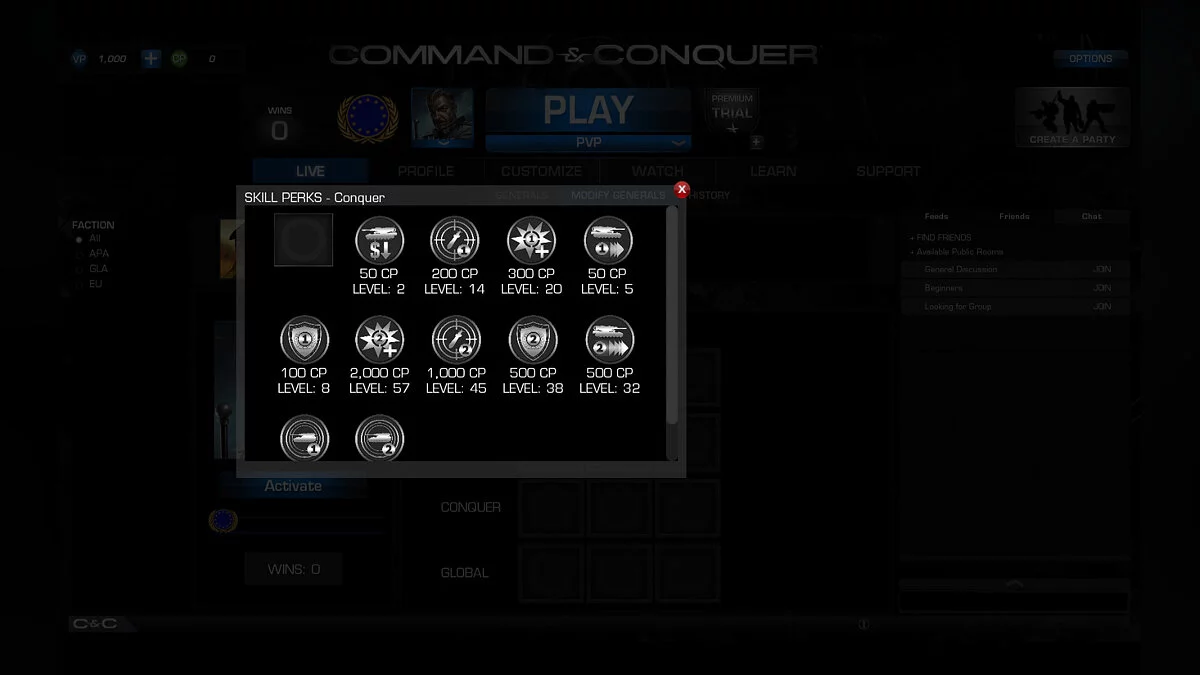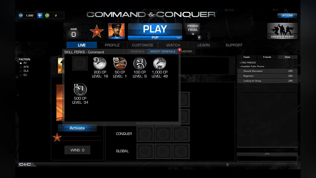 Однако новые генералы — это еще не все то, куда игрок мог потратить честно надроченные в игре деньги. Вы могли купить улучшенные способности для своего генерала. Назывались они Command, Control, Conquer и Global. Перки в графе Command улучшали глобальные способности, а в графах Control, Global и Conquer уменьшали стоимость юнитов и увеличивали их огневую мощь.