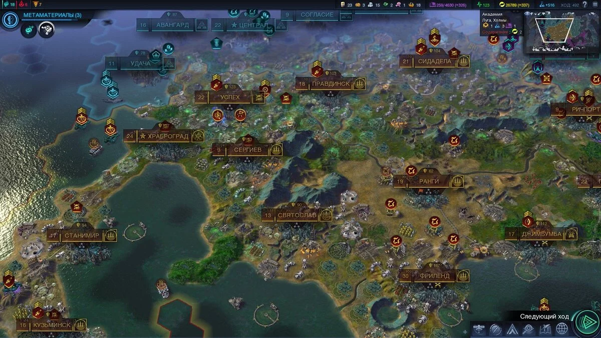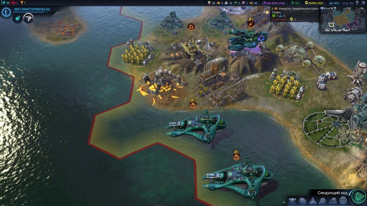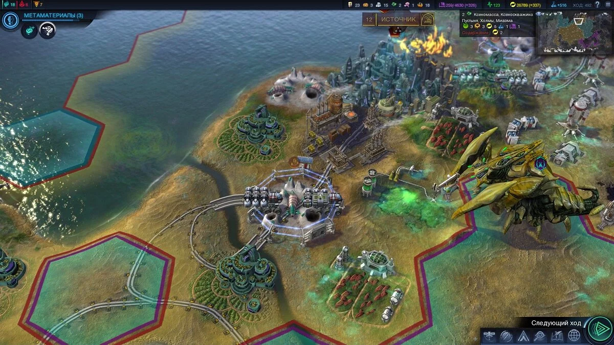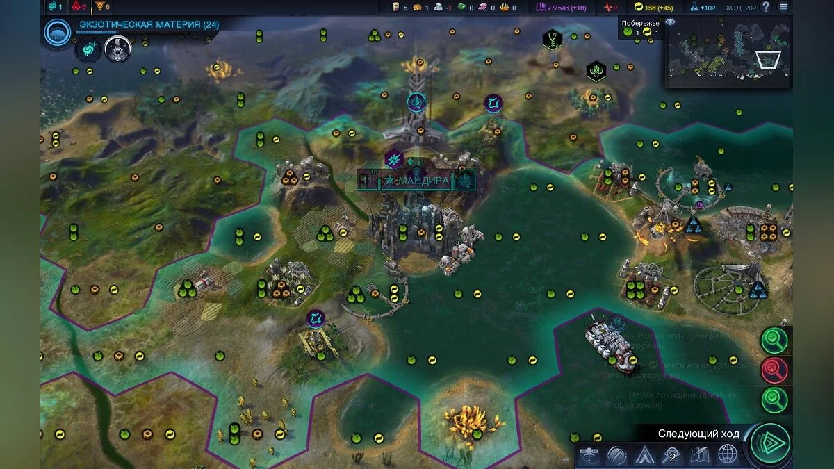 Необходимо концентрировать клетки по типам бонусов — академии строить ближе к научным городам, купола размещать недалеко от культурных городов, заводы около промышленных центров и так далее. Развитие очень зависит и от ресурсов. Традиционные железо, алюминий и уран заменили экологически чистыми веществами — титаном, геотермальными источниками, ксеномассой и прочим.