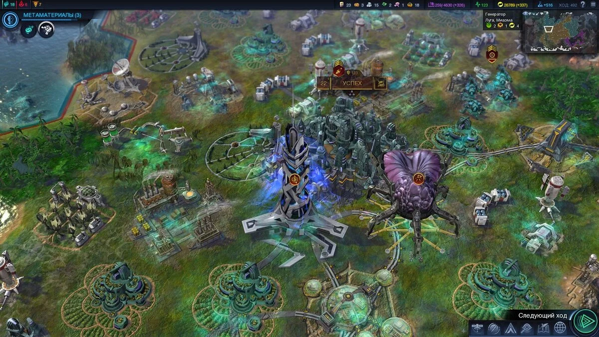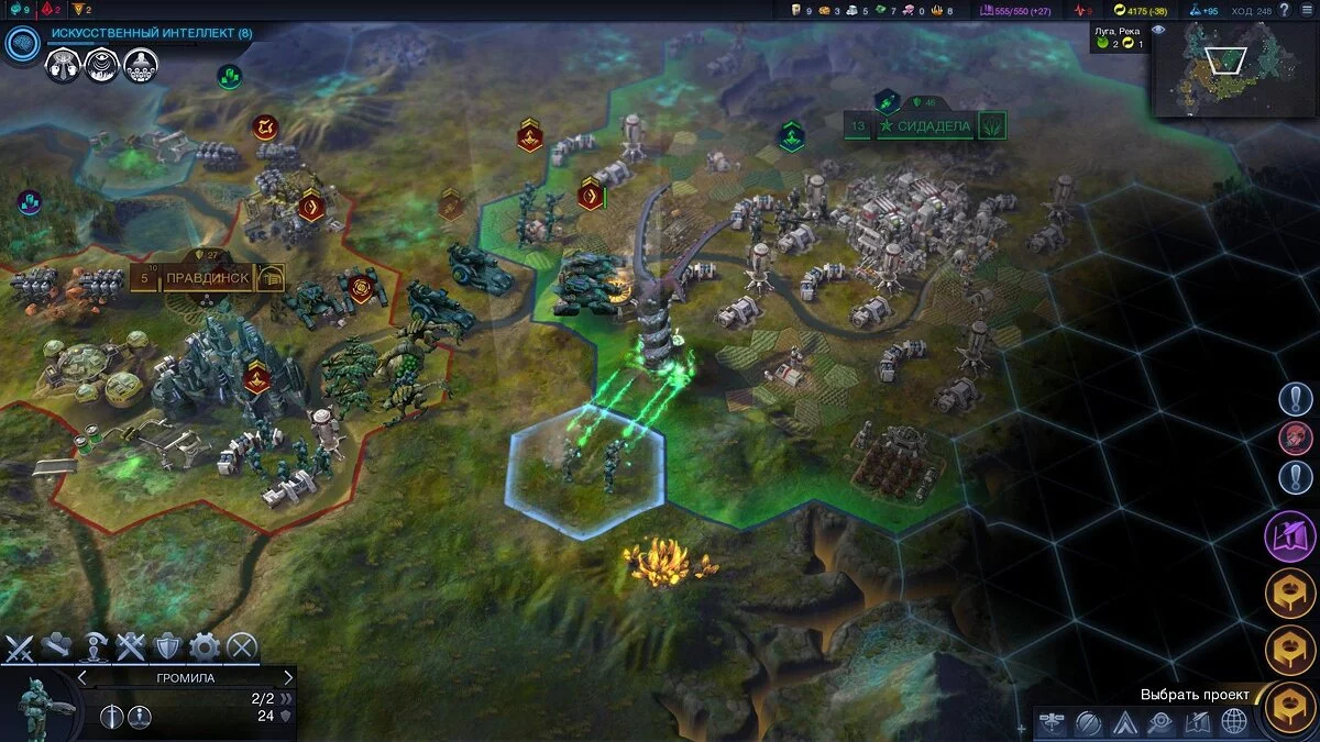 Зато нововведение в лице спутников работает как часы. Эти механизмы играют очень большую роль в игровом процессе. Не брезгуйте ими, так как 3-4 хода на постройку стократ окупятся увеличенной выработкой энергии, поддержкой обороняющихся или наступающих войск и влиянием на другие цивилизации. Также спутники распыляют или собирают миазму — зеленый газ, который опасен, а при соответствующем улучшении полезен, для юнитов.