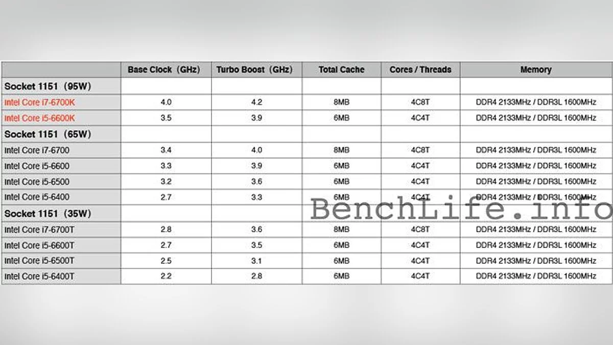 До премьеры настольных процессоров Intel Skylake остаётся всё меньше времени, и китайский ресурс BenchLife вызвался подлить масла в огонь. В опубликованной ниже таблице можно видеть предполагаемые названия и характеристики новинок с суффиксом S и, в кои-то веки, человеческой нумерацией.
