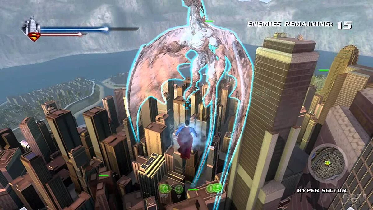 В свое время лицензию на создание игр по фильму получил не тот разработчик. Игры были ужасными, все до единой. Супермен всегда получал ту самую часть говна, которую по факту должны были получать другие, менее популярные на то время персонажи. Создавая Superman Returns, EA наконец вспомнили, что Супермен, сука, неуязвим. И никаких полосок жизней ему не нужно! Наконец-то одумавшись, разработчики сделали хелсбар для города, который Супермен курирует! И это уже имеет смысл, ведь как только город будет уничтожен или порабощен, то Кларк Кент «погибнет». Полетит на свой Криптон самолично. Ну и полоска, в целом, красивая.