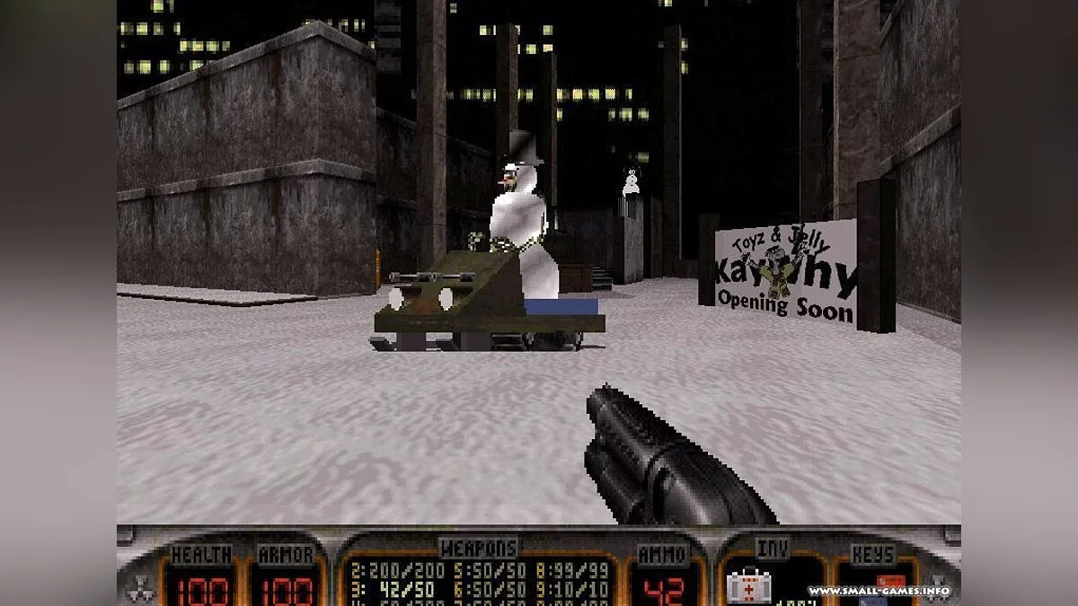 Ядерная зима — это плохо. Убийц-снеговиков я до сих пор понять не могу. Как и игру в целом. Под очень дружелюбную музыку на вас выскакивает куча разных монстров, в том числе выпрыгивают и сами снеговики. Они сильные и шутить с ними нельзя. Плохие парни используют их как самое сильное оружие против Дюка, а те, за неимением ног, ведут себя как простые часовые. Некоторые из них катаются на машинах и даже на чем-то летают. Новый год будет спасен, дамы и господа, ведь Дюк пришел как следует набухаться и уничтожить всех на своем пути. И он уже набухался.