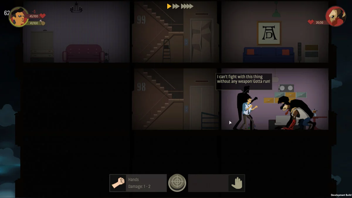 Механика Skyhill больше всего напоминает таковую в This War of Mine. Нам по-прежнему нужно собирать ресурсы для выживания, обустраивать свою лачугу, с трудом убивать противников и продвигаться все дальше и дальше. Однако, несмотря на всю схожесть, есть и некоторые различия. Игра в некотором роде имеет пошаговую модель. То есть, совершая один ход мы теряем одно очко сытости. Когда шкала будет пустая наш герой начнет голодать, из-за чего и вовсе может откинуть копыта. Чтобы этого не случилось, мы постоянно должны искать еду и припасы. Едой может быть почти все, что только переваривает человеческий желудок — сырой рис, укроп, чеснок, сахар и т.п. Помимо нормальной пищи может встретиться и не совсем съедобная — гнилая. Съев ее, герой может отравиться и потерять здоровье, зато желудок набьет.