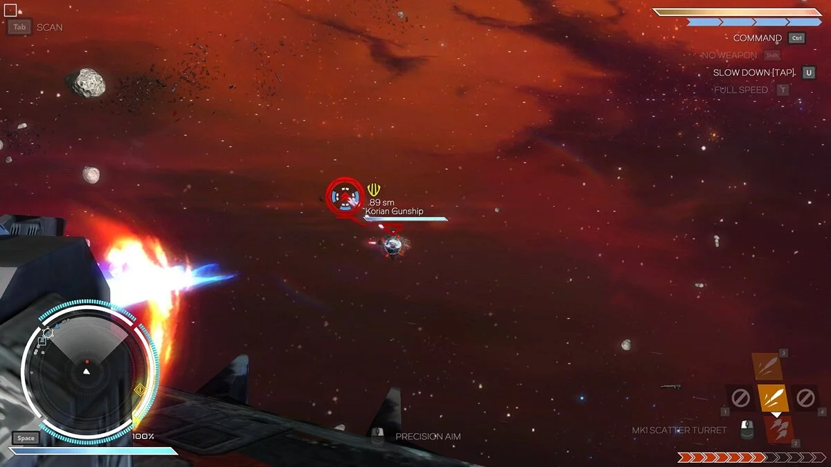 У них это получилось благодаря ряду правил. Во-первых, игровой мир Rebel Galaxy представляет собой не сферу, а диск, то есть вы перемещаетесь не по трем, а только по двум координатам или еще можно сказать, перемещаетесь в одной плоскости. Конечно, это серьезное упрощение, однако, на игровом процессе это значительно не сказалось — какая разница, как перемещаться в этом огромном и пустом космическом пространстве?