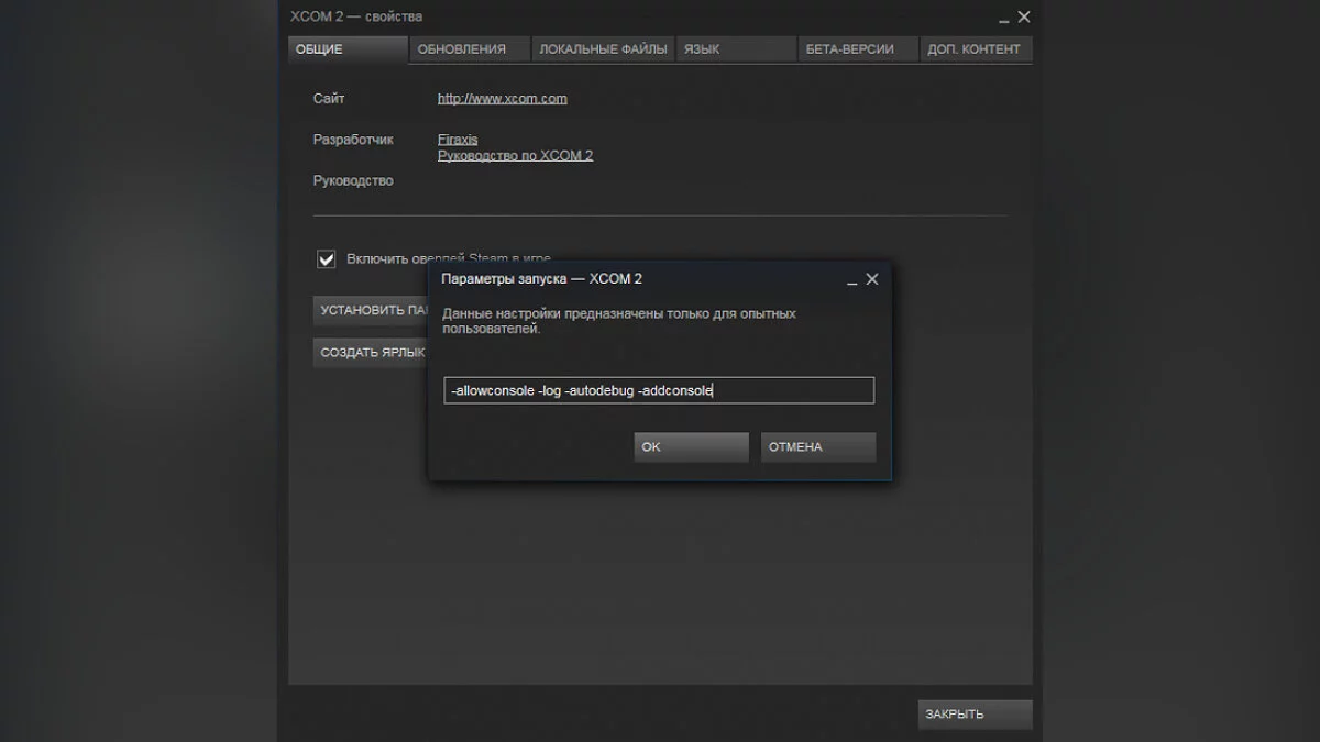 Аналогичную операцию можно сделать и через ярлык игры, но придется заменить тот, что создается Steam на тот, что лежит в папке с игрой (XCOM 2BinariesWin64), введите -allowconsole -log -autodebug –addconsole в строку «Объект»: