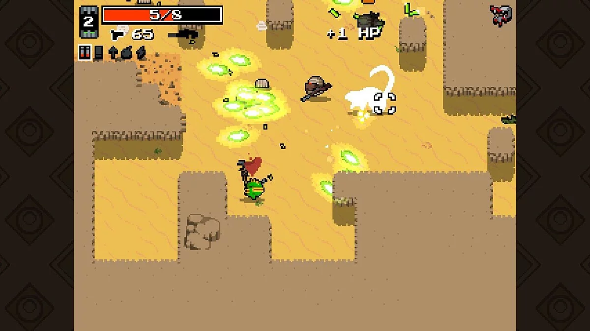 Nuclear Throne в той версии, в которой увидел её я, представляет собой бодрый bullet hell. Переведя это выражение, вы получите фразу, характеризующую игры, где в вашего персонажа выпускают столько пуль, что они застилают собой большую часть экрана. Что бы вы не делали, скорее всего, персонаж схватит хотя бы одну в ограниченном экраном пространстве — и тут остаётся надеяться либо на высокий уровень здоровья, либо щит-улучшение. Либо грамотно пользоваться укрытиями и стрелять, как Клинт Иствуд (Clint Eastwood).