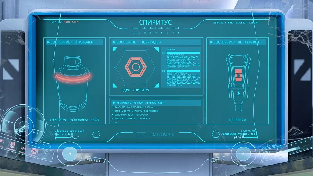 Мелочь, а приятно — Adr1ft является одной из немногих игр, где практически любой дисплей можно изучить вдоль и поперек благодаря высокому уровню его проработки. По ходу прохождения героиня будет часто иметь с ними дело, так что этот аспект весьма важен в плане аутентичности. Отображаемая информация не только легко читается с дальней дистанции, но и является своеобразной справочной, навигатором и информатором о целях миссии одновременно.