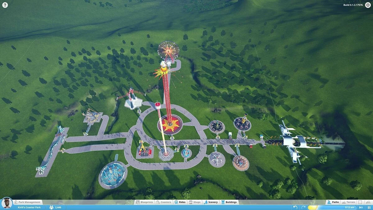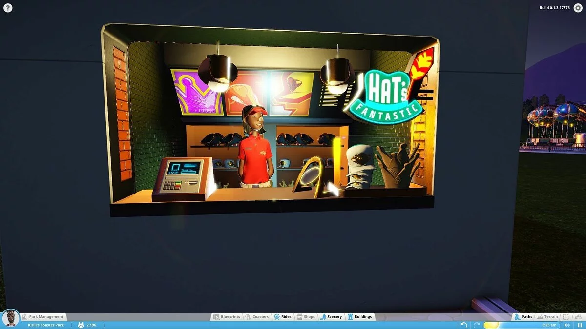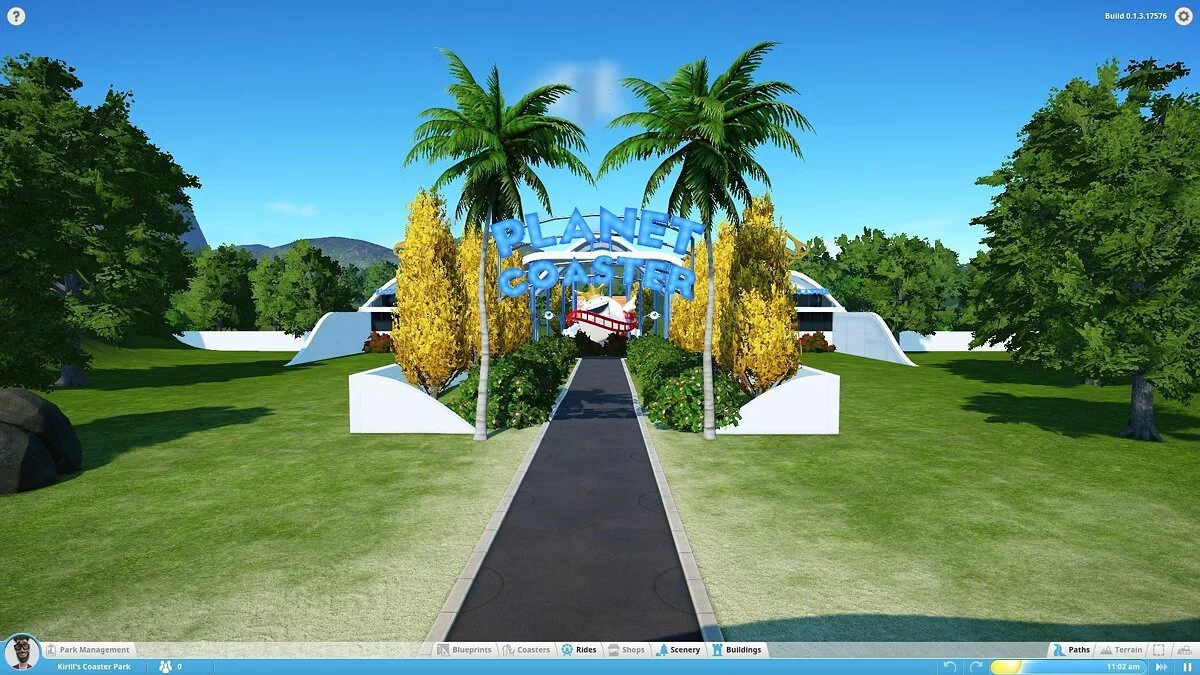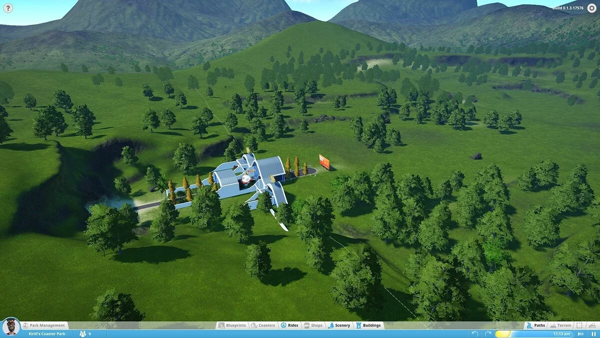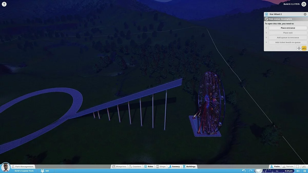 В моей версии можно было строить аттракционы (колесо обозрения, цепочную карусель и т.д.), здания и их части (киоски, стены, крыши, украшения) и устанавливать декоративные объекты, не имеющие прямого отношения к предложениям парка (деревья, вывески, пушки и бургеры). Это не очень много. То, что имеется сейчас, похоже на демонстрацию движка с чуть более чем минимальным количеством сооружений. Разработчики уделяют особое внимание возможности создать собственный аттракцион по кирпичику, продумать все движущиеся компоненты, но заниматься этим будут только крайне увлечённые.