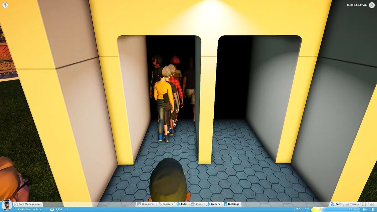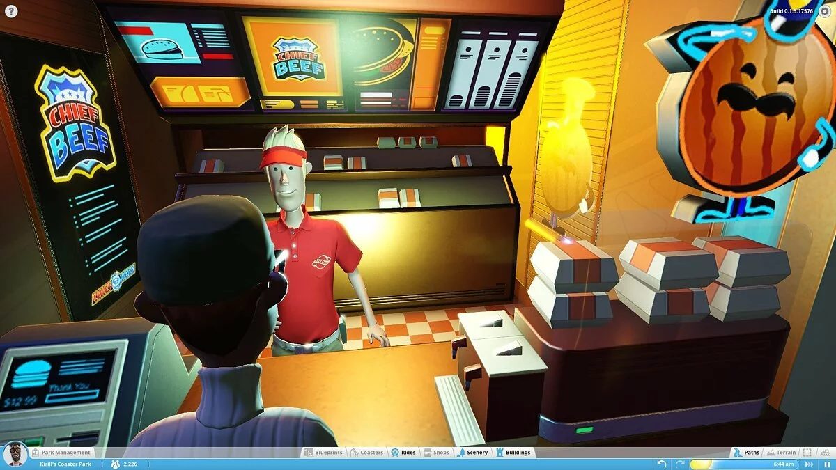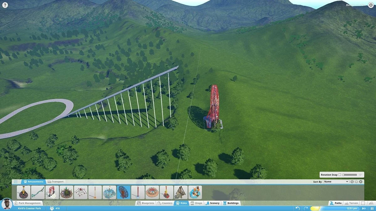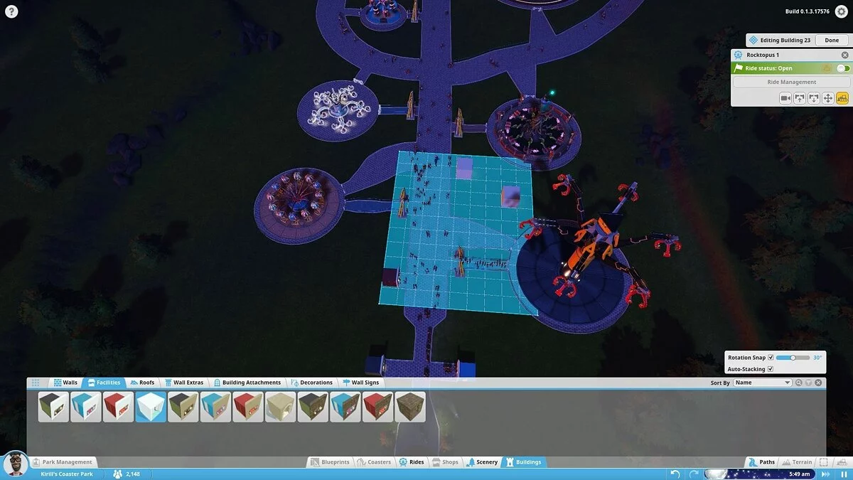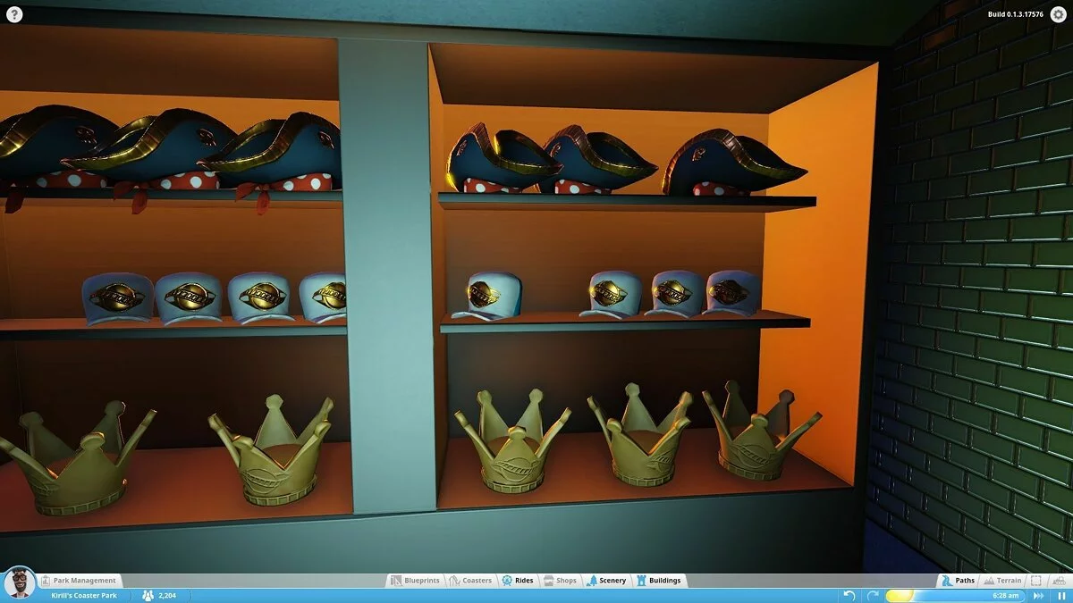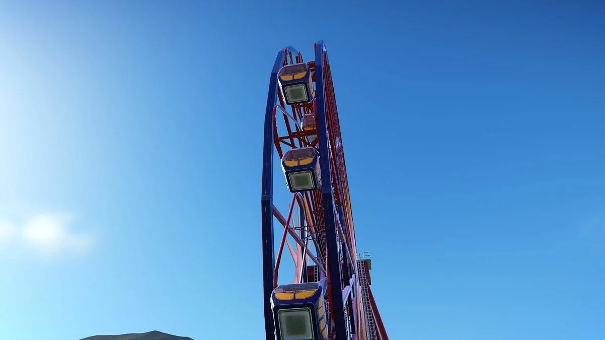 В моей версии можно было строить аттракционы (колесо обозрения, цепочную карусель и т.д.), здания и их части (киоски, стены, крыши, украшения) и устанавливать декоративные объекты, не имеющие прямого отношения к предложениям парка (деревья, вывески, пушки и бургеры). Это не очень много. То, что имеется сейчас, похоже на демонстрацию движка с чуть более чем минимальным количеством сооружений. Разработчики уделяют особое внимание возможности создать собственный аттракцион по кирпичику, продумать все движущиеся компоненты, но заниматься этим будут только крайне увлечённые.