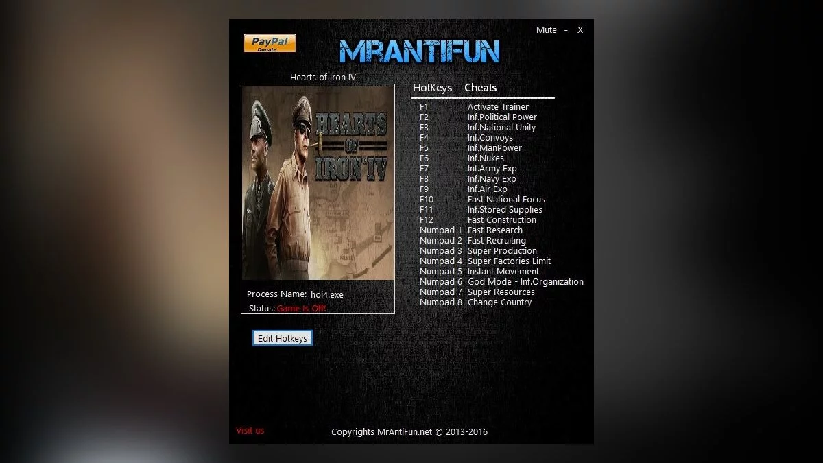 Hearts of Iron 4 — глобальная стратегия о второй мировой войне, являющаяся продолжением серии Hearts of Iron. В данной статье содержатся различные чит-коды и трейнер, при помощи которого можно будет пройти игру чуть легче — получить бесконечный опыт, быструю вербовку юнитов, получить много ресурсов, а так же еще многое другое.