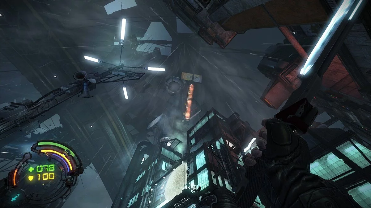 А чем же нас порадуют музыка и звуки мира. Музыка в Hard Reset Redux подобрана нужного стиля и набирает обороты во время боевых стычек. По ней вы поймёте, когда около вас появляются враги. Какого-то крутого трека не имеется, но музыка неплохо подбадривает. А вот звуки мира… Да, разная поверхность издаёт разные звуки от наших шагов. Да, разные бочки или места разрушения звучат неплохо. Но окружающий мир? Он пустой! Вот мы видим огромный корабль, который пролетает над нами, но никаких звуков нет. Где шумы из домов, где шум остального города? Почему нет никаких звуков от всего того, что находится в метре от нас… Это немного печалит.
