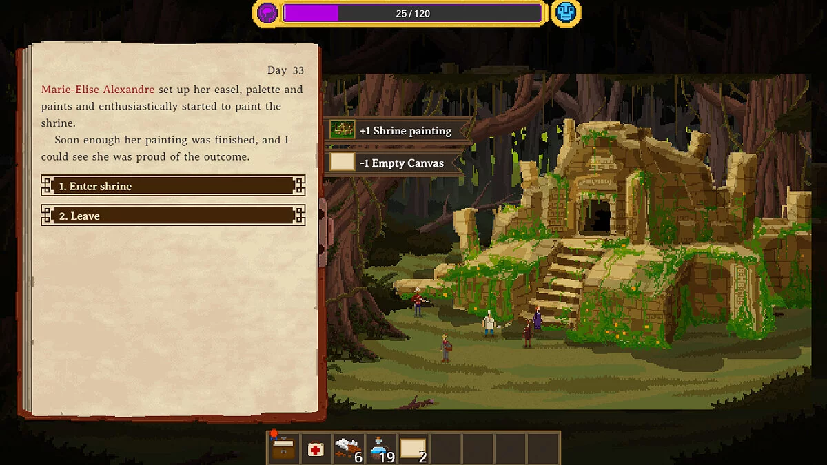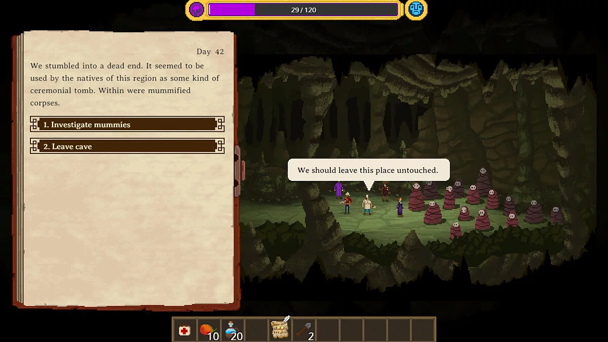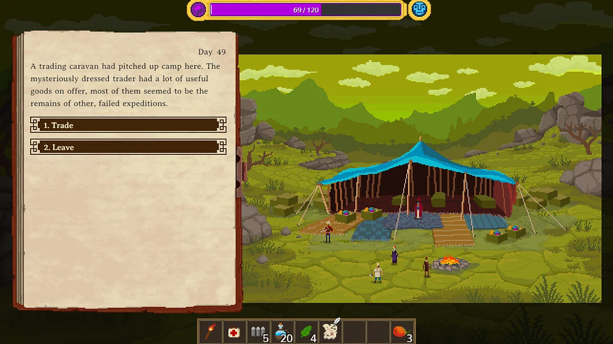 По завершению каждой экспедиции можно выбрать себе перк из предложенных, что облегчает путешествия, например, «Полиглот» — для более тесного сотрудничества с аборигенами. Не стоит также забывать и про прокачку членов вашей команды — сильнее, быстрее, выносливее, талантливее. Если кто-то показал себя не так хорошо, как вы ожидали, всегда можно его заменить на нового персонажа. К примеру, если вы предпочитаете агрессивный подход, то художник будет только помехой.