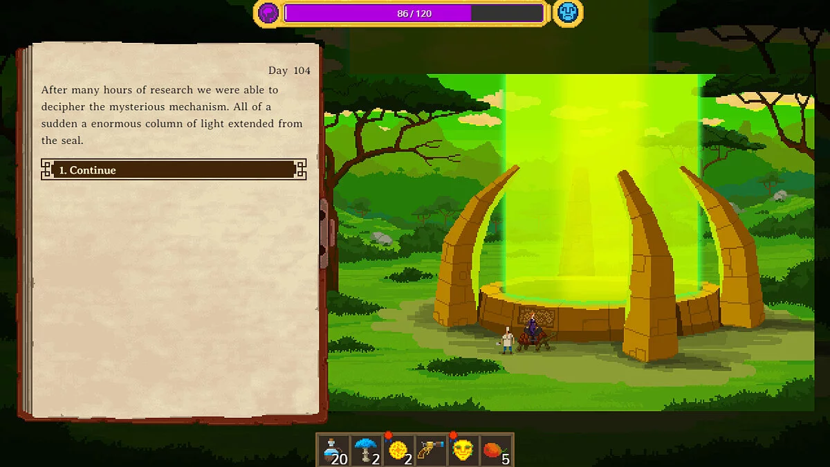 Уж в чём нельзя отказать большинству инди-проектов, так это в хорошем музыкальном сопровождении. И Curious Expedition не исключение в этом правиле — первые 5 минут, проведённые в меню, я просто сидел и наслаждался приятной бесшовной музыкой, которая своими нотками и ритмами ласкает слух. Хорошее начало, не правда ли? Приятный пиксельный пейзаж на фоне отлично дополняет картину.