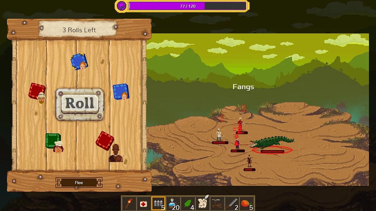 Она тут тоже особенная. У каждого вашего спутника, как и у вас, есть набор игральных костей. Красные кости соответствуют атаке, синие — интеллекту, зелёные — защите. Отдельным тёмно-бирюзовым цветом идут кубики оружия. После броска, если нам повезло, и кости обратились нужной нам стороной, мы сможем из них составить комбинацию. Например, два «Удара мечом» образуют двойной удар, а «Удар мечом» и «Зрение» позволит провести точечную атаку с возможным бонусом в виде кровотечения у противника.