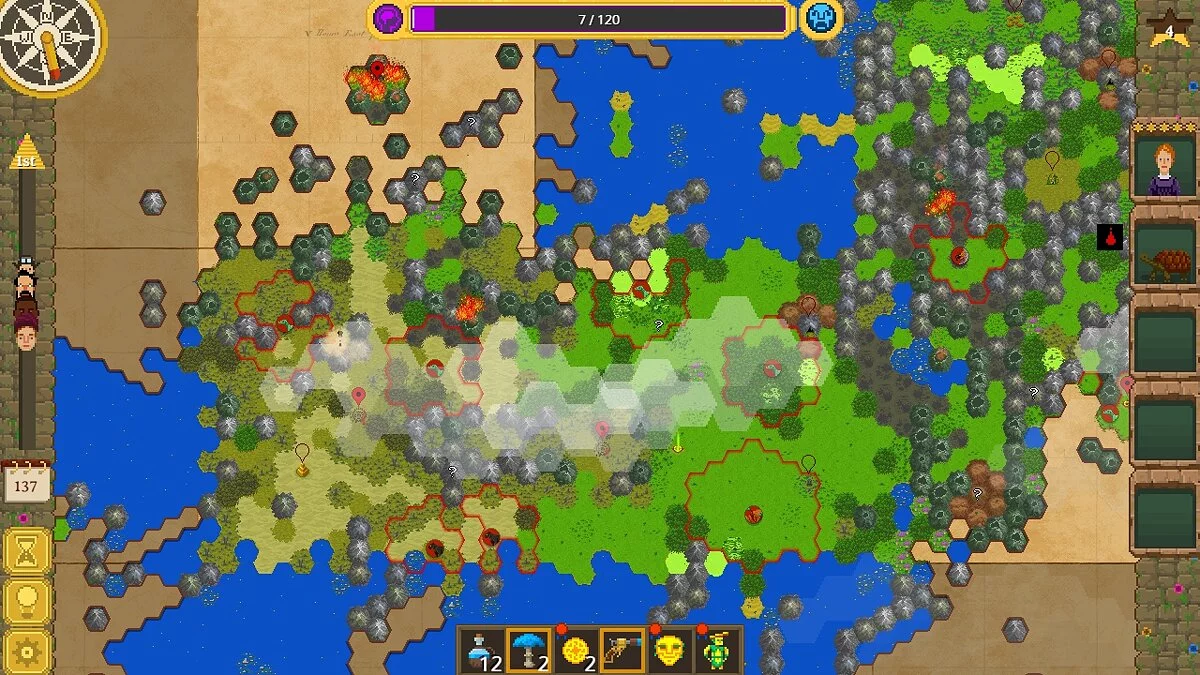 Первая особенность игры, которую мы встречаем, — процедурная генерация локаций. Никаких повторяющихся монотонных экспедиций, каждый следующий раз отличается от всех предыдущих. Гексагональные ячейки представлены во множестве вариантов, отличаясь при этом не только своей текстурой, но и своими характеристиками: например, передвижение через равнины происходит значительно легче, чем через леса, а на горные вершины не взобраться без специальных приспособлений.
