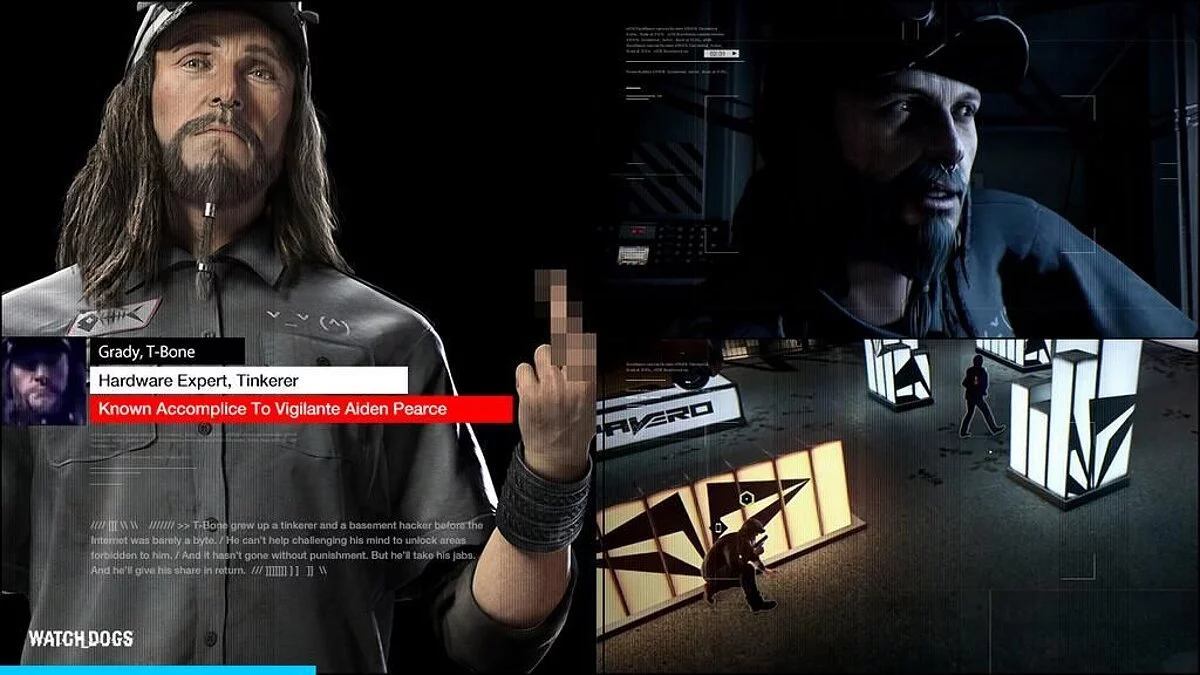 Уже не молодой мальчик, а более, чем взрослый мужчина из Watch Dogs. Ти-Бон обладает довольно покладистым нравом, любит выпить и может похвастаться отличными хакерскими способностями и тем, что он — мастер на все руки. Борода, длинные волосы, пирсинг и косичка на подбородке — отличительные черты данного мужчины.