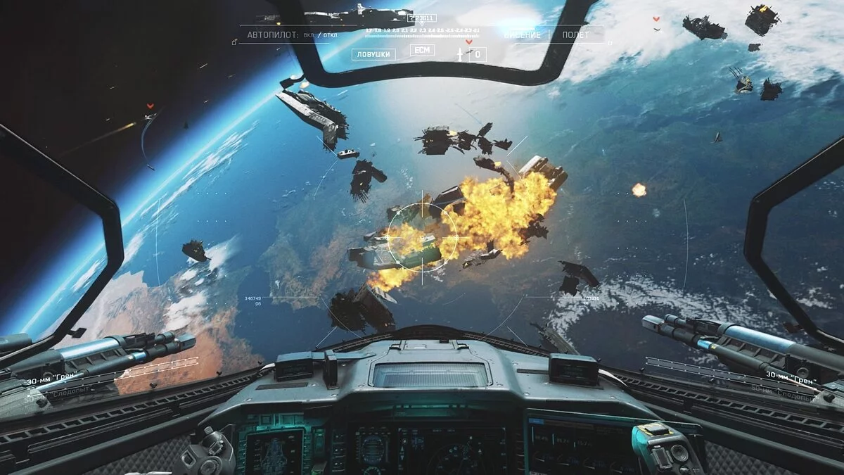 Именно поэтому следует наслаждаться каждой второстепенной задачей. Они делятся на два типа — штурм корабля и сражения на истребителях типа Шакал. Сложно выделить что-то одно, ведь каждый вариант развлечения в Infinite Warfare интересен до самого конца. Истребители атакуют друг друга разными типами вооружения изредка выпуская контр-меры, и могут легко захватывать цель по нажатию L2 — там же появляется рассчитанный прицел для стрельбы на упреждение. Это позволяет сосредоточится на враге и забыть об управлении — оно переходит в автоматический режим. Звучит проще простого, но интеллект вражеских асов и элемент прокачки Шакалов не дает заскучать даже после многократных сражений.