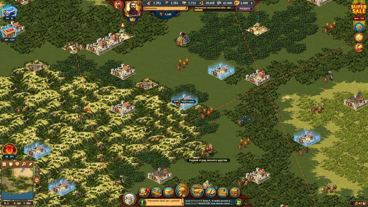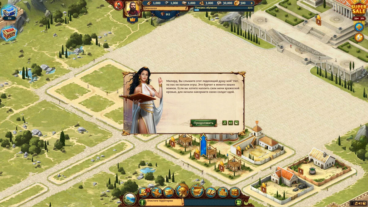 В довольно дотошном обучающем режиме разработчики знакомят новоиспеченного властителя с базовыми возможностями: постройкой зданий для добычи ресурсов, наймом войск, исследованием технологий и другими функциями, которых поначалу кажется довольно много. На деле же экономика игры проста, как две копейки.